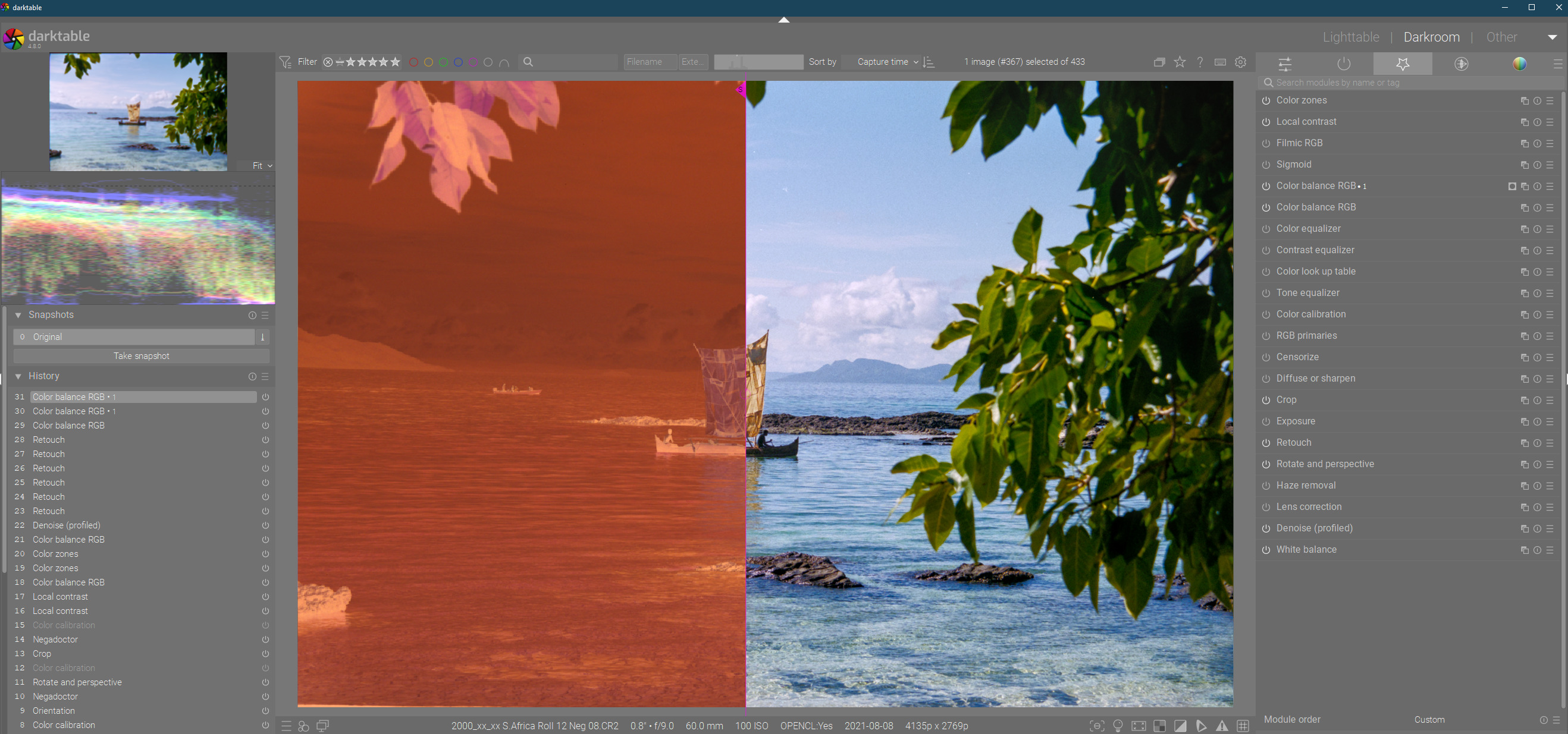 If you want to do the split-screen effect I did in my original post using a snapshot, you’ll need to select an appropriate point in the history after the neg has been oriented, etc.