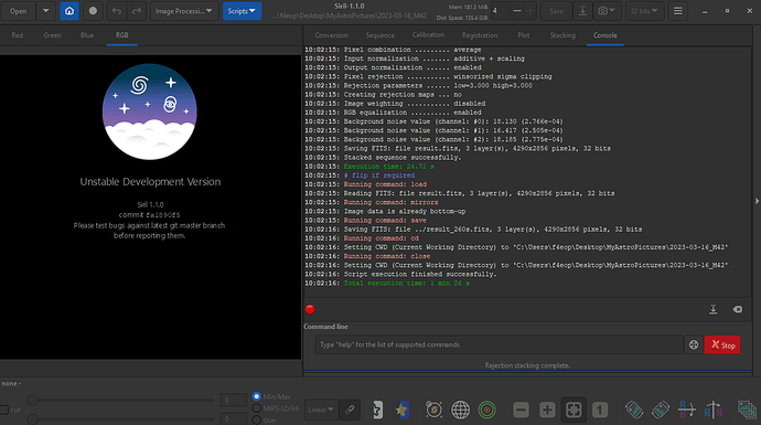 I am using Windows10, 64 bit, 1.2.0 downloaded from the Siril website to replace the 1.2.0-beta 2 that was giving me problems after downloading the preprocessing scripts, (prepr w/out darks, pre-pro w/out flats, etc). I had gotten a message that I needed to enable developer mode, which I had never seen before. I followed the instructions on my computer to do that, but didn’t know why Siril wanted me to do that. When that didn’t work, I replaced that version, 1.2.0-beta2 with 1.2.0. It then said that stacking failed. Here is the latest log that I am getting now. (I hope this is an acceptable way to send this. If not please instruct) Taylor-Log.txt (3.3 KB)