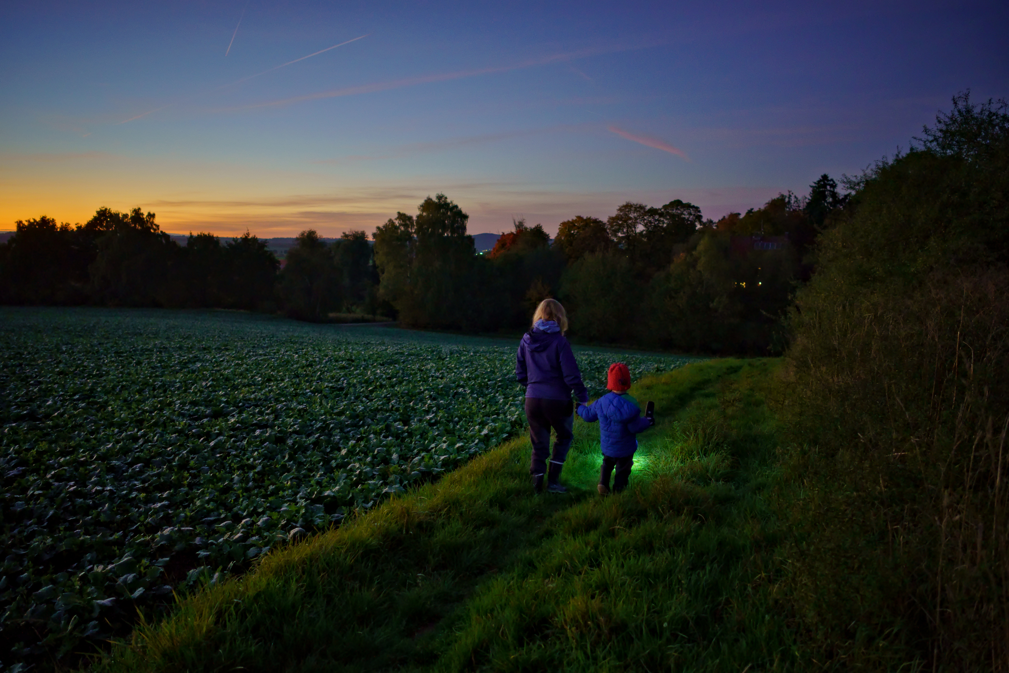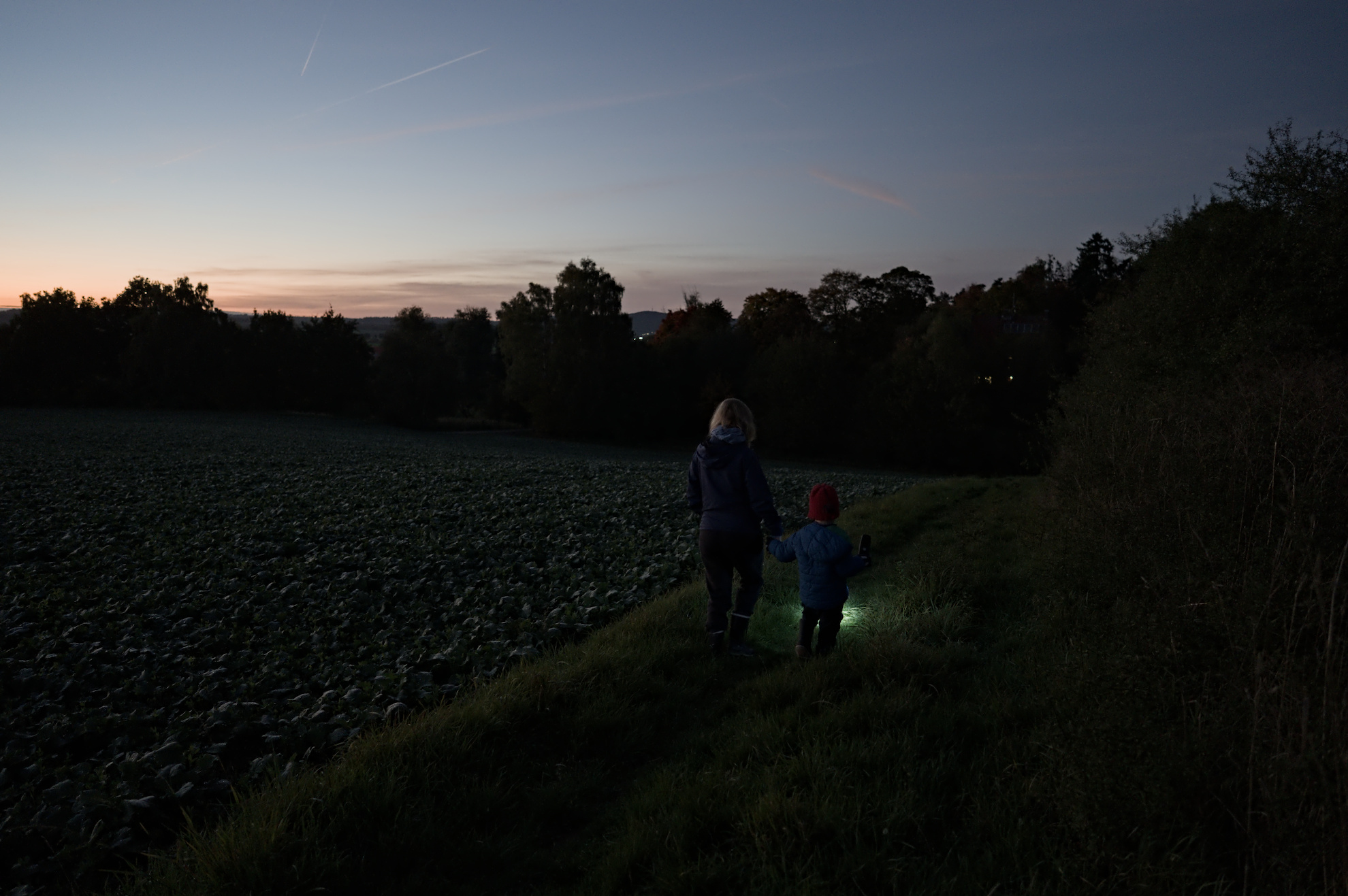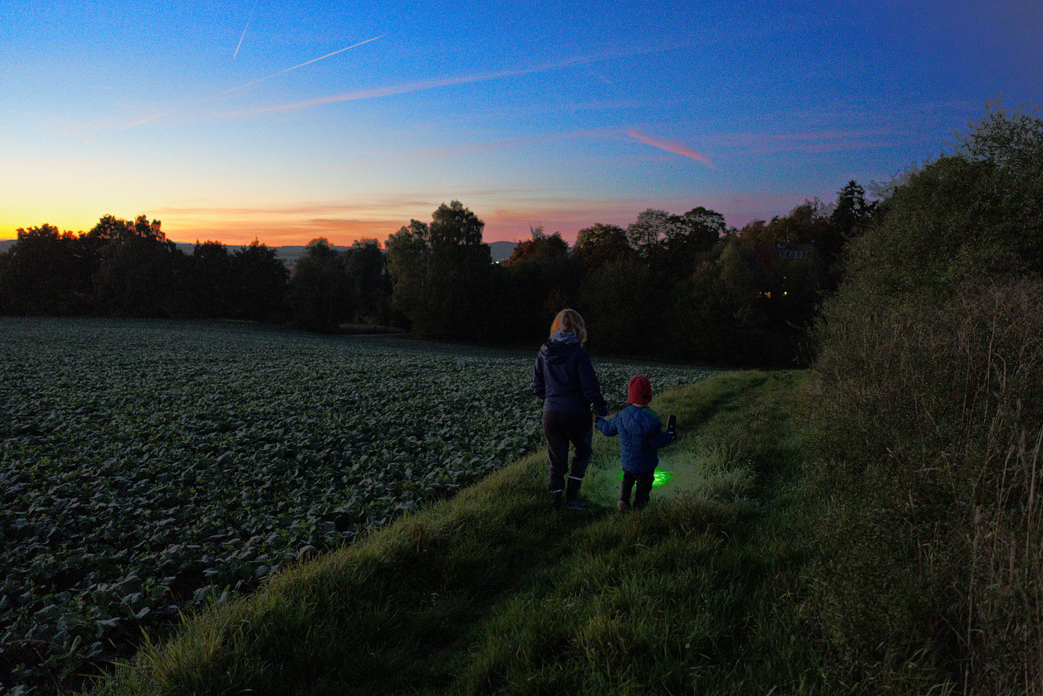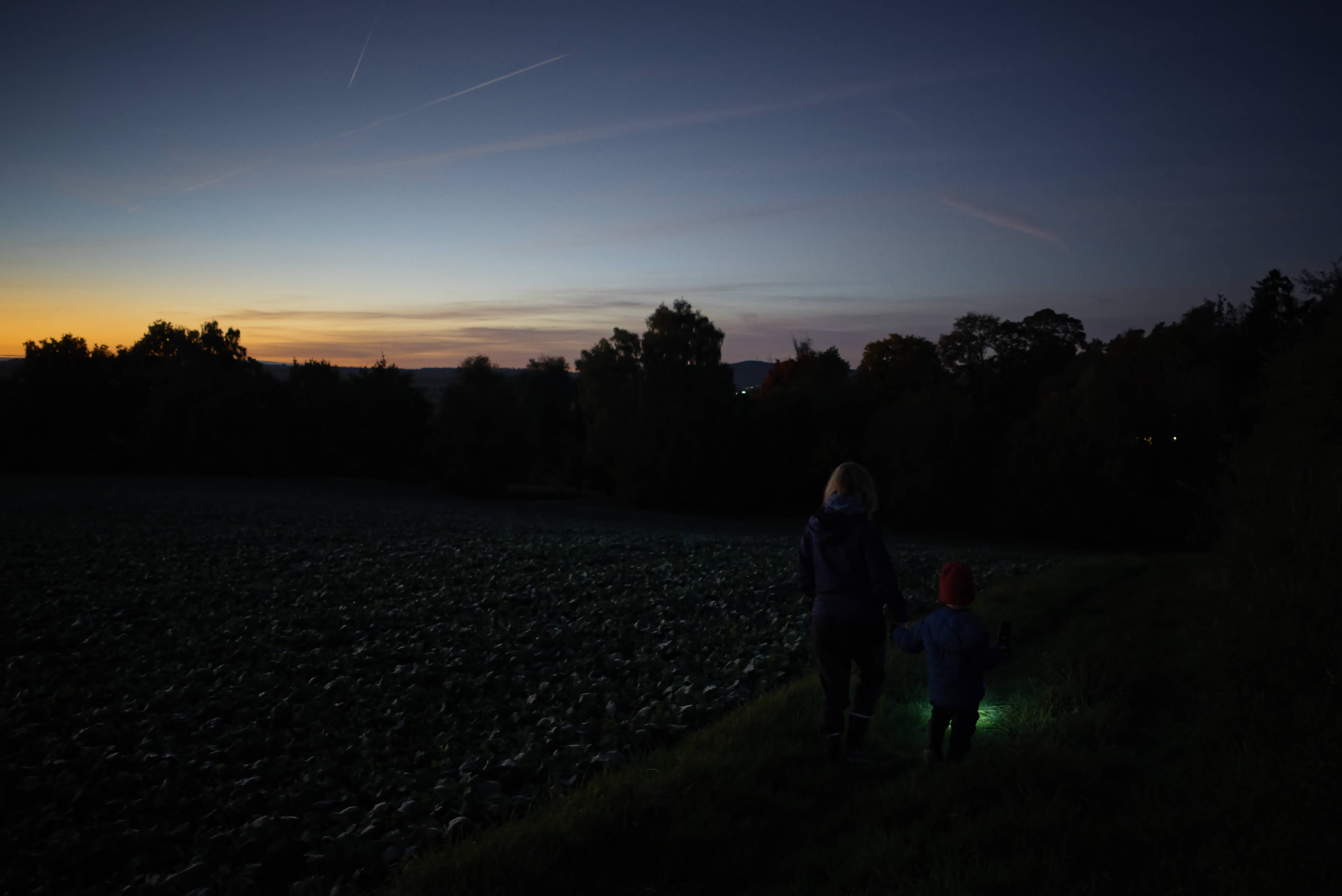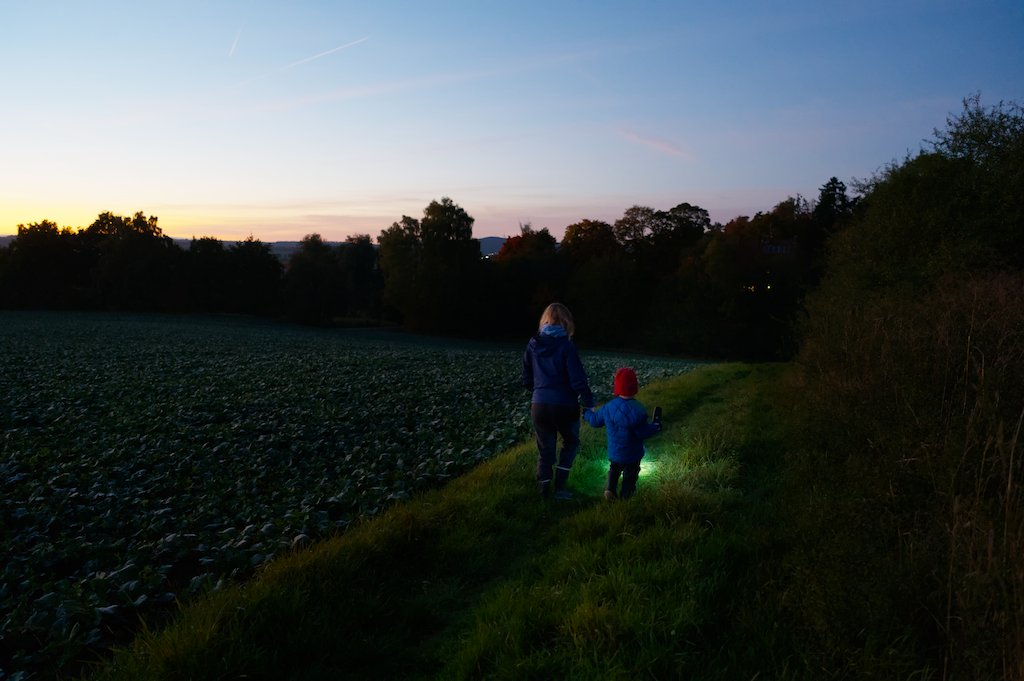On yesterdays evening we took a short hike around the neighbourhood and through an adjacent field. Our son loved lighting our way with the flashlight and the sunset was beautiful. As the sun set, more and more stars appeared and we saw some airplanes and even a satellite (the latter excited me way more then my son ).