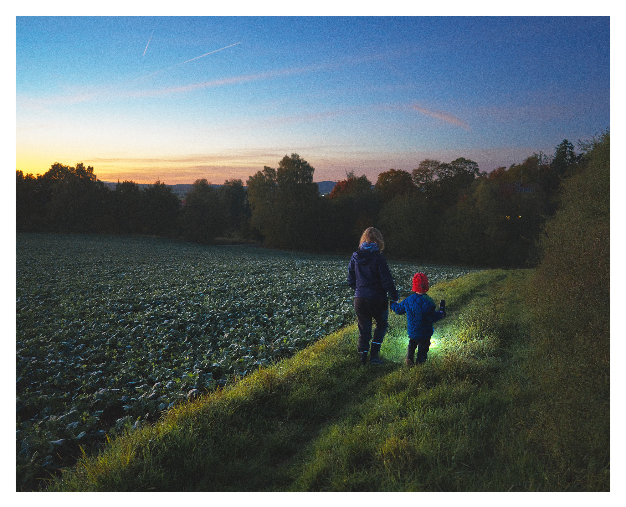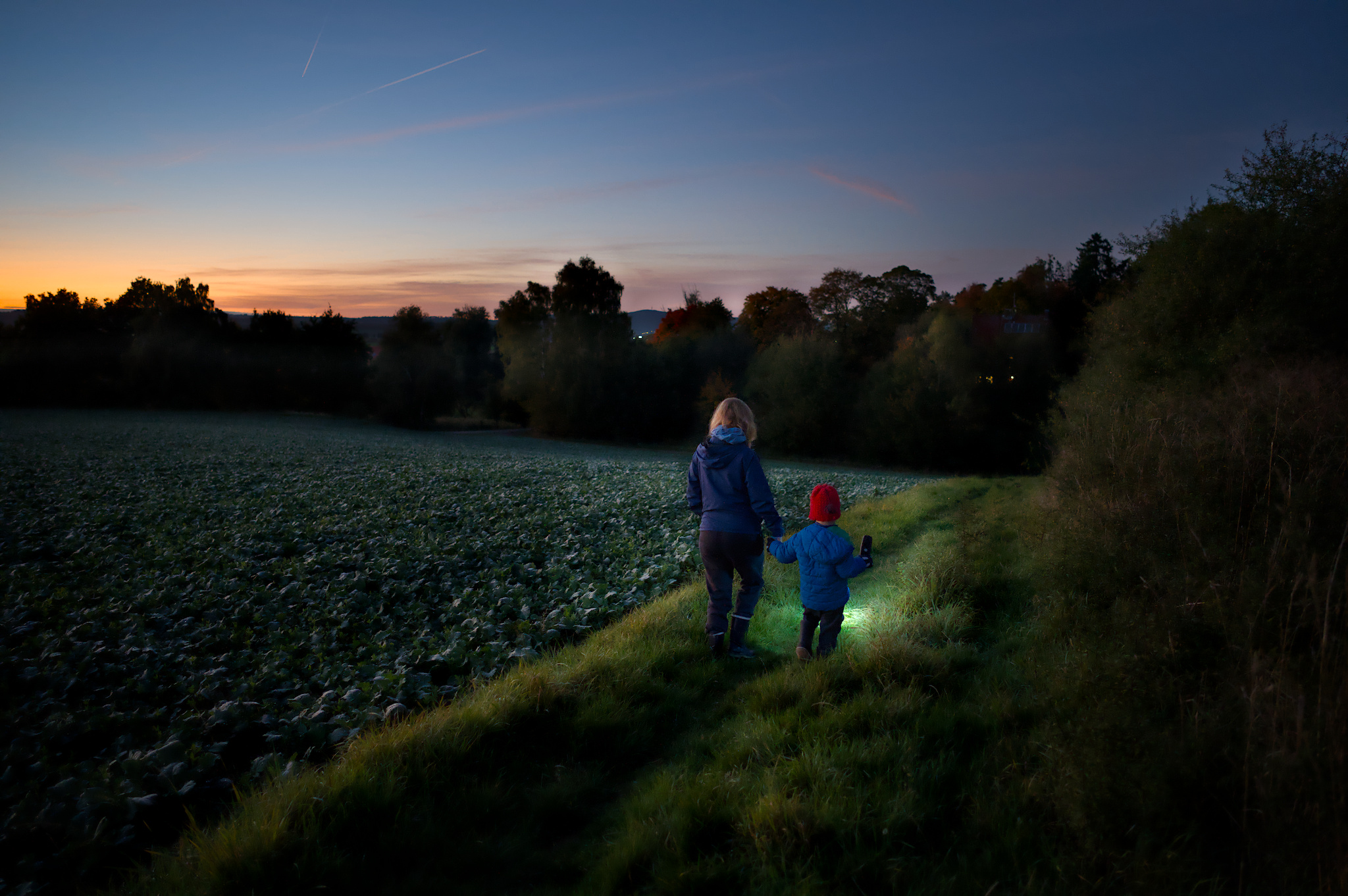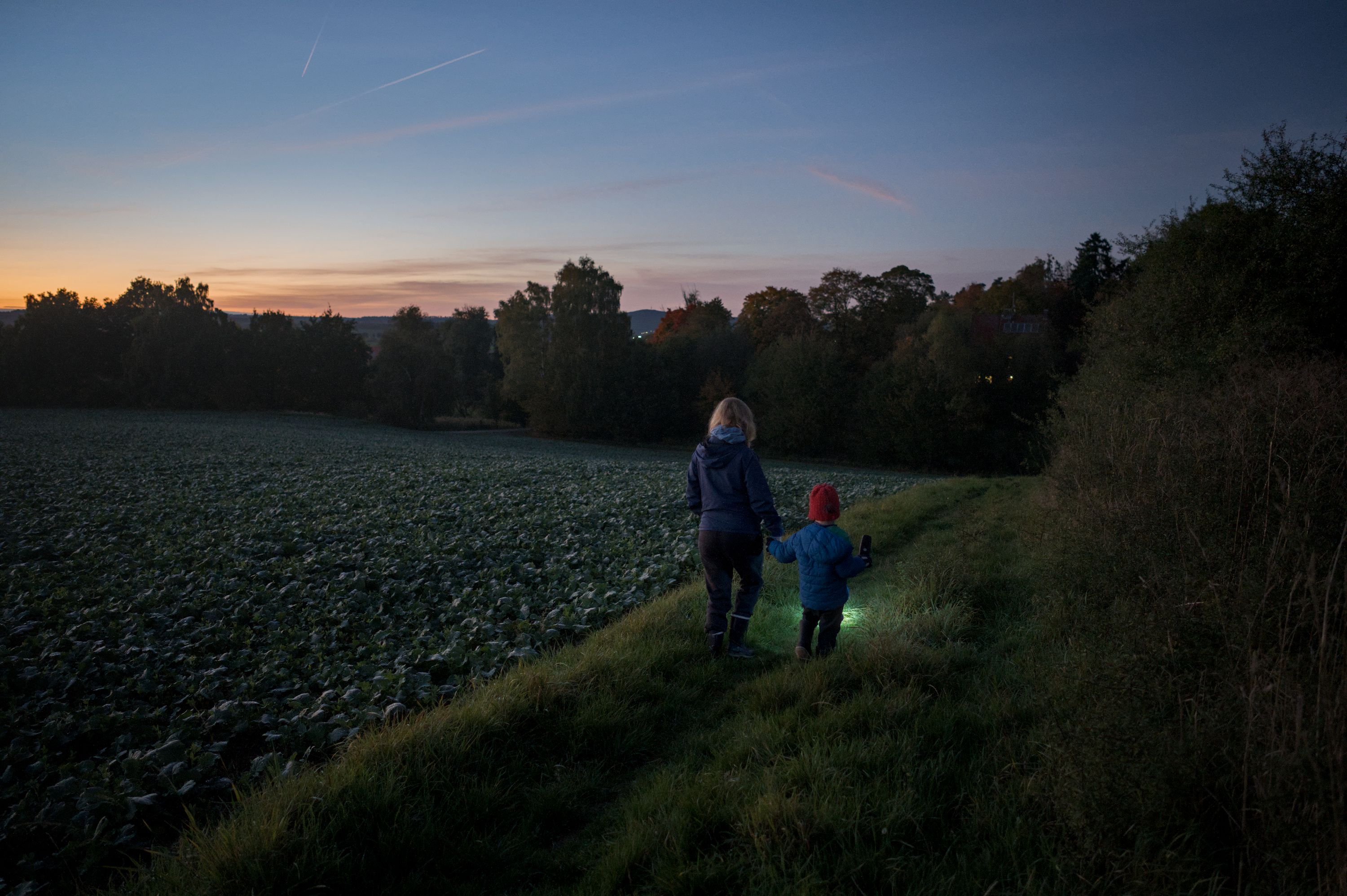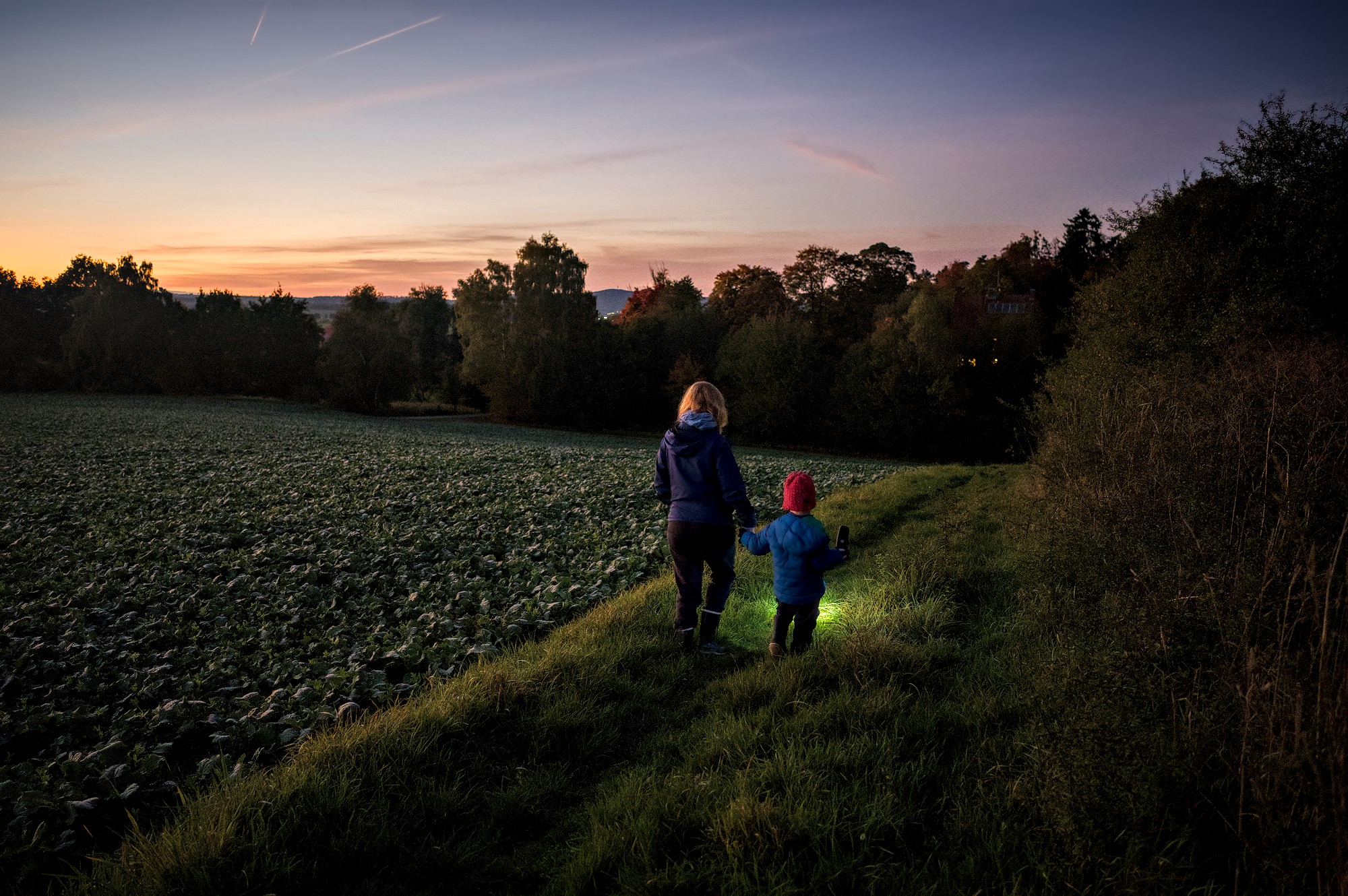 On yesterdays evening we took a short hike around the neighbourhood and through an adjacent field. Our son loved lighting our way with the flashlight and the sunset was beautiful. As the sun set, more and more stars appeared and we saw some airplanes and even a satellite (the latter excited me way more then my son ).