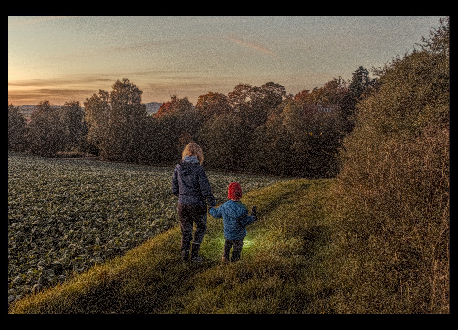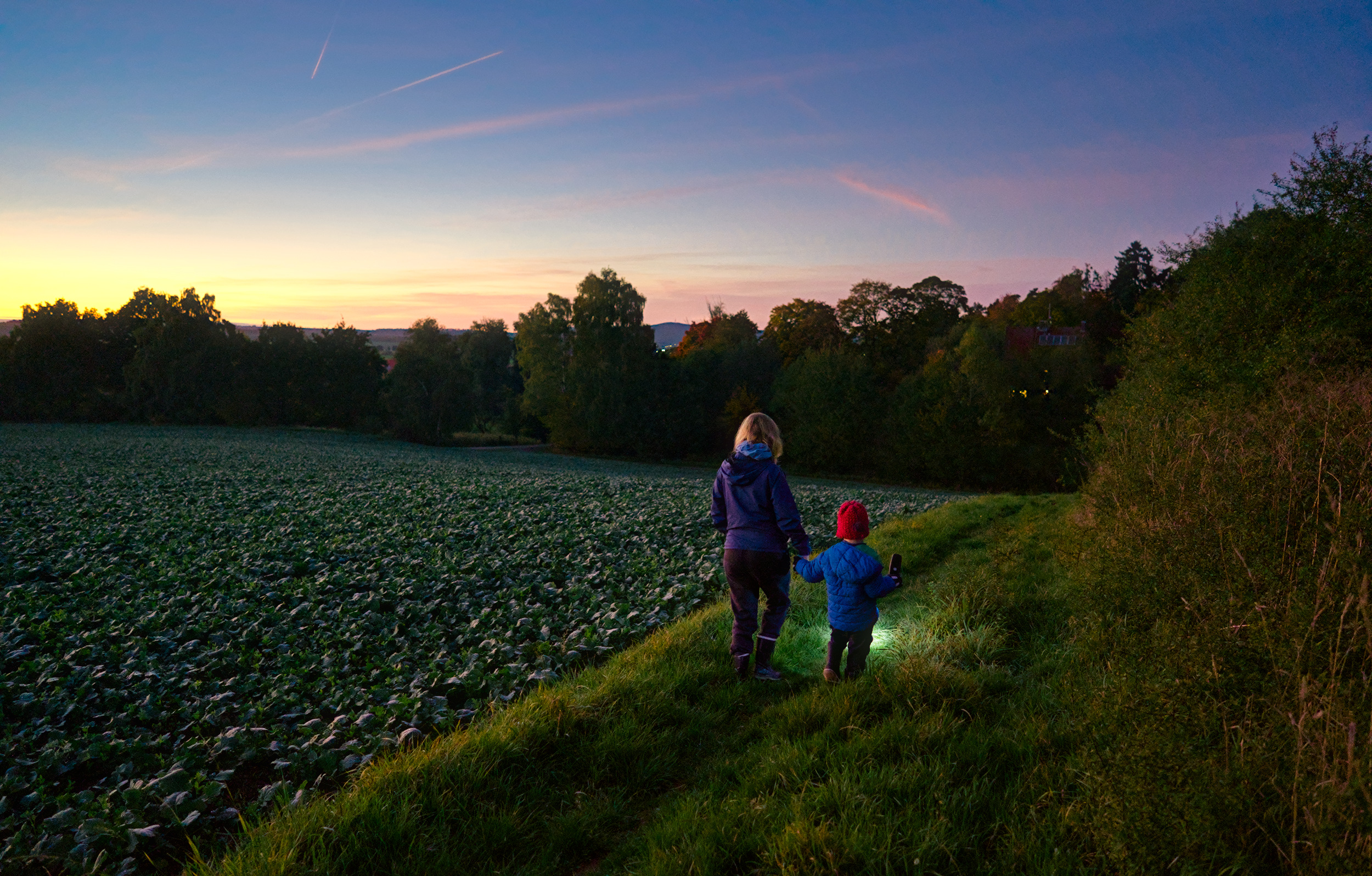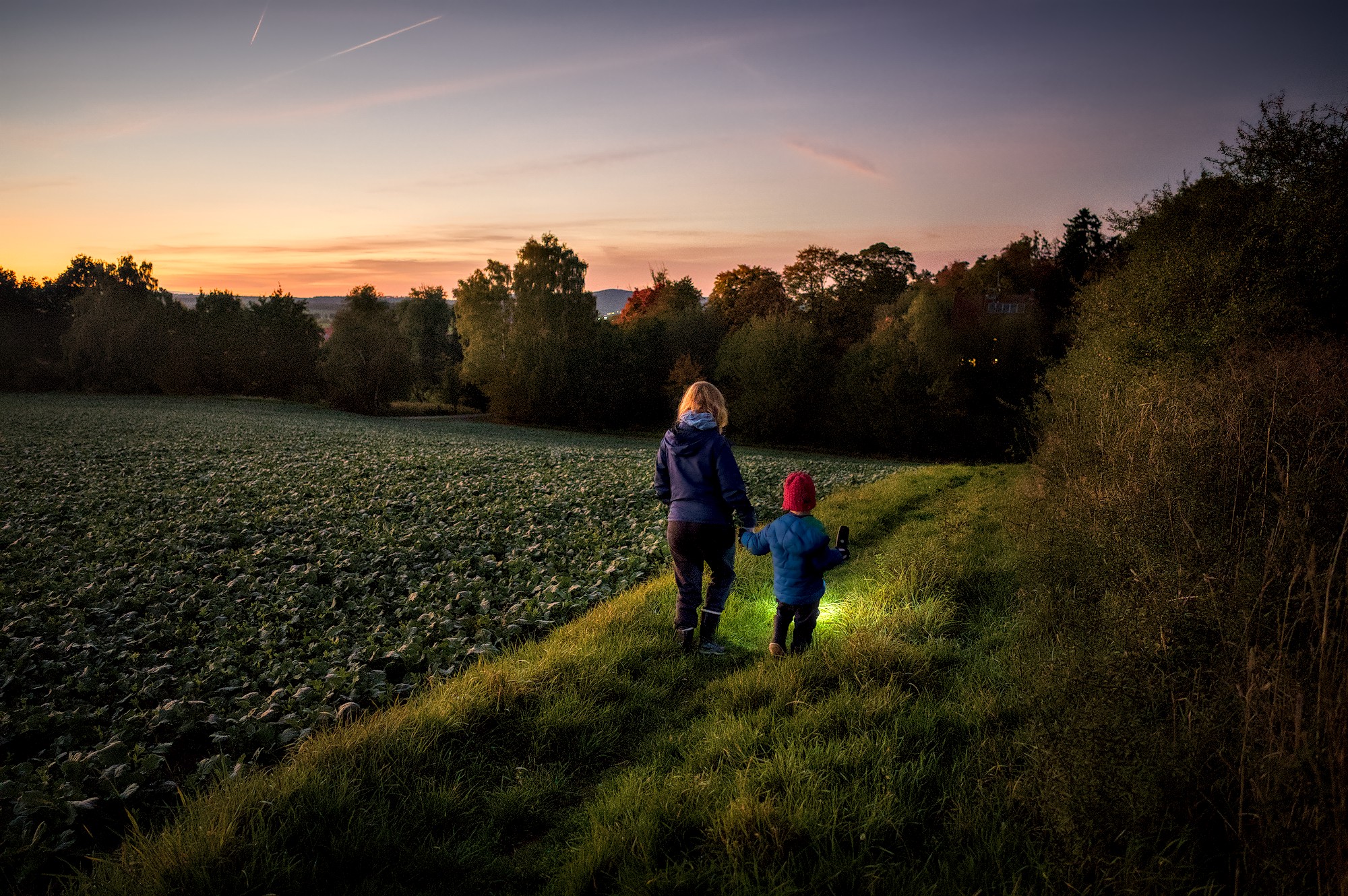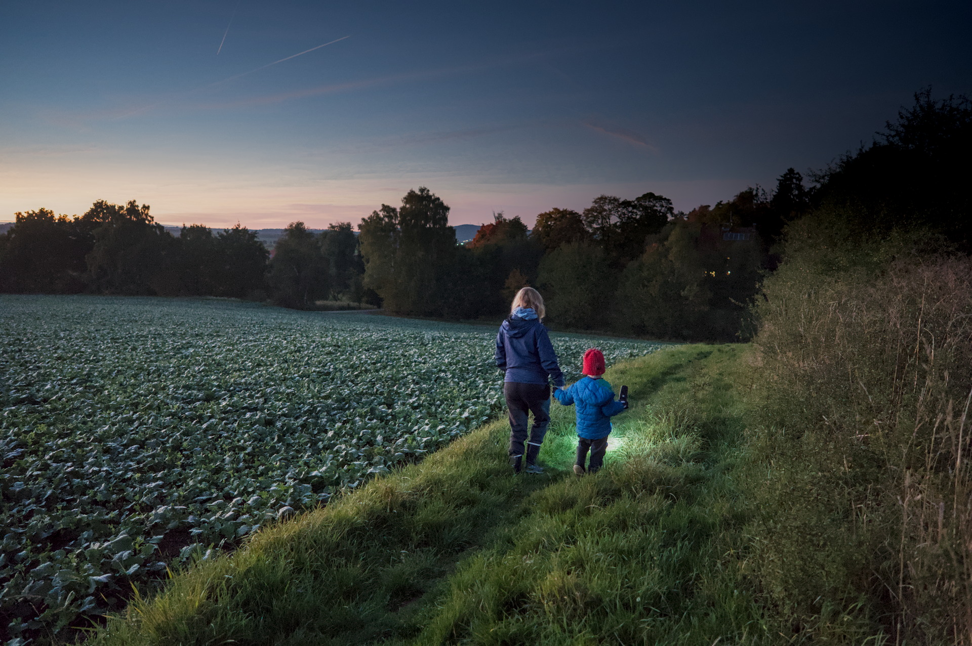 On yesterdays evening we took a short hike around the neighbourhood and through an adjacent field. Our son loved lighting our way with the flashlight and the sunset was beautiful. As the sun set, more and more stars appeared and we saw some airplanes and even a satellite (the latter excited me way more then my son ).
