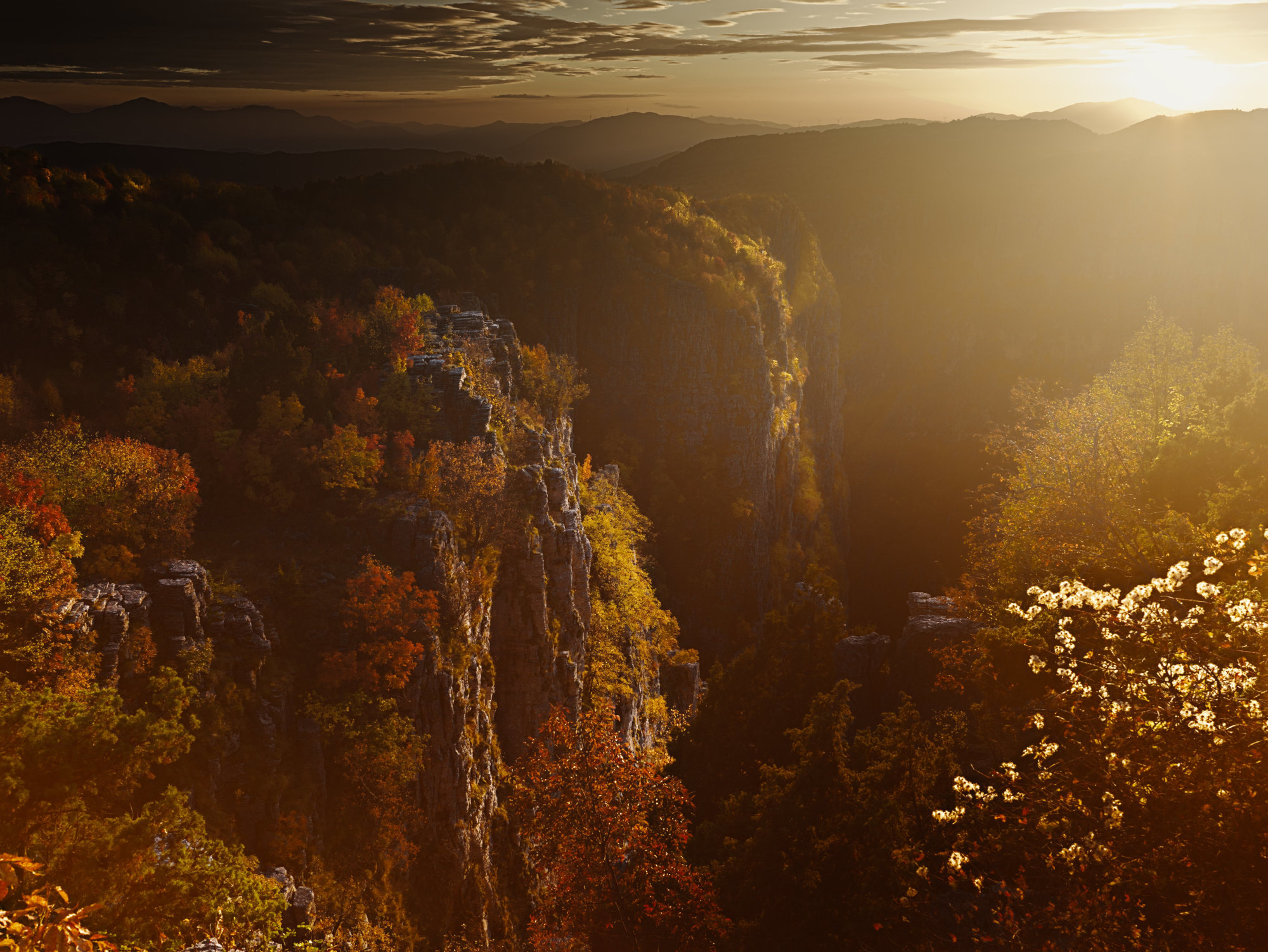 What is very beautiful about this photo is the illumination of the autumn leaves on the rock plants by the setting sun.