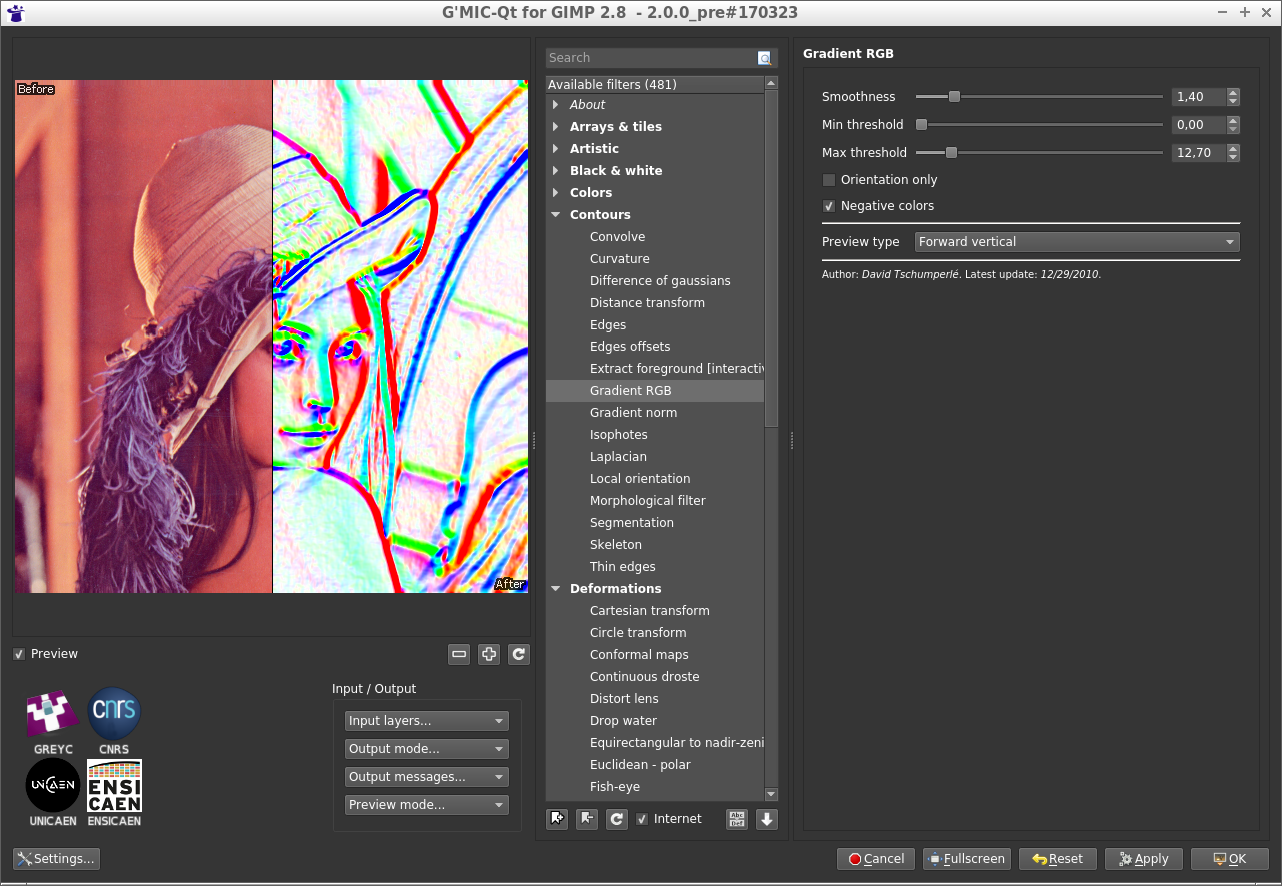Brian (at GIMPChat) just gave me a head’s up that another update was released today. Just did a few tests and so far great (and fast). Just a question. When will the qt version be official and also, is anyone working on an 8bf (Photoshop) launcher for the stand-alone qt version so that PS can pipe layer(s) to the new G’MIC preset and get results? Just curious.