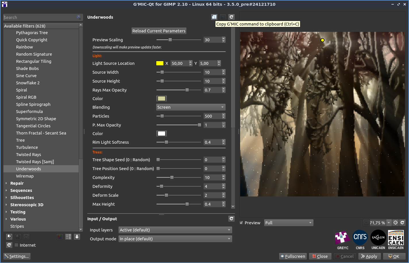 $ gmic input.jpg pr_underwoods 0,30,50,5,10,10,0.7,208,208,156,34,500,1,255,255,255,0.4,0,0,10,4,2,0.4,0,20,15,10,0,1,15,10,0,0.8,100,0,0,40,30,0,40,20,0,20,10,0,0,0,0,0.2,34,0 -o output.jpg
