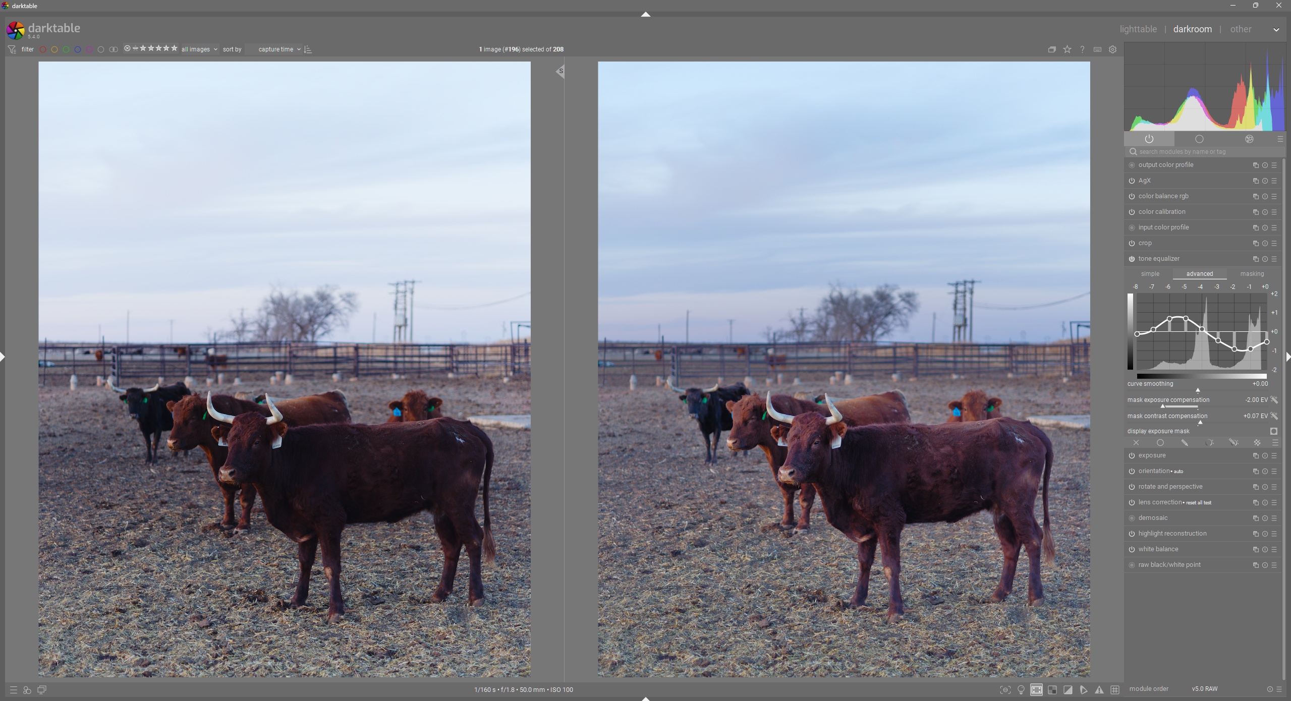 Left = “without tone eq”, Right = “with tone eq”, both with the auto-picker for white/black relative exposure enabled in AgX.