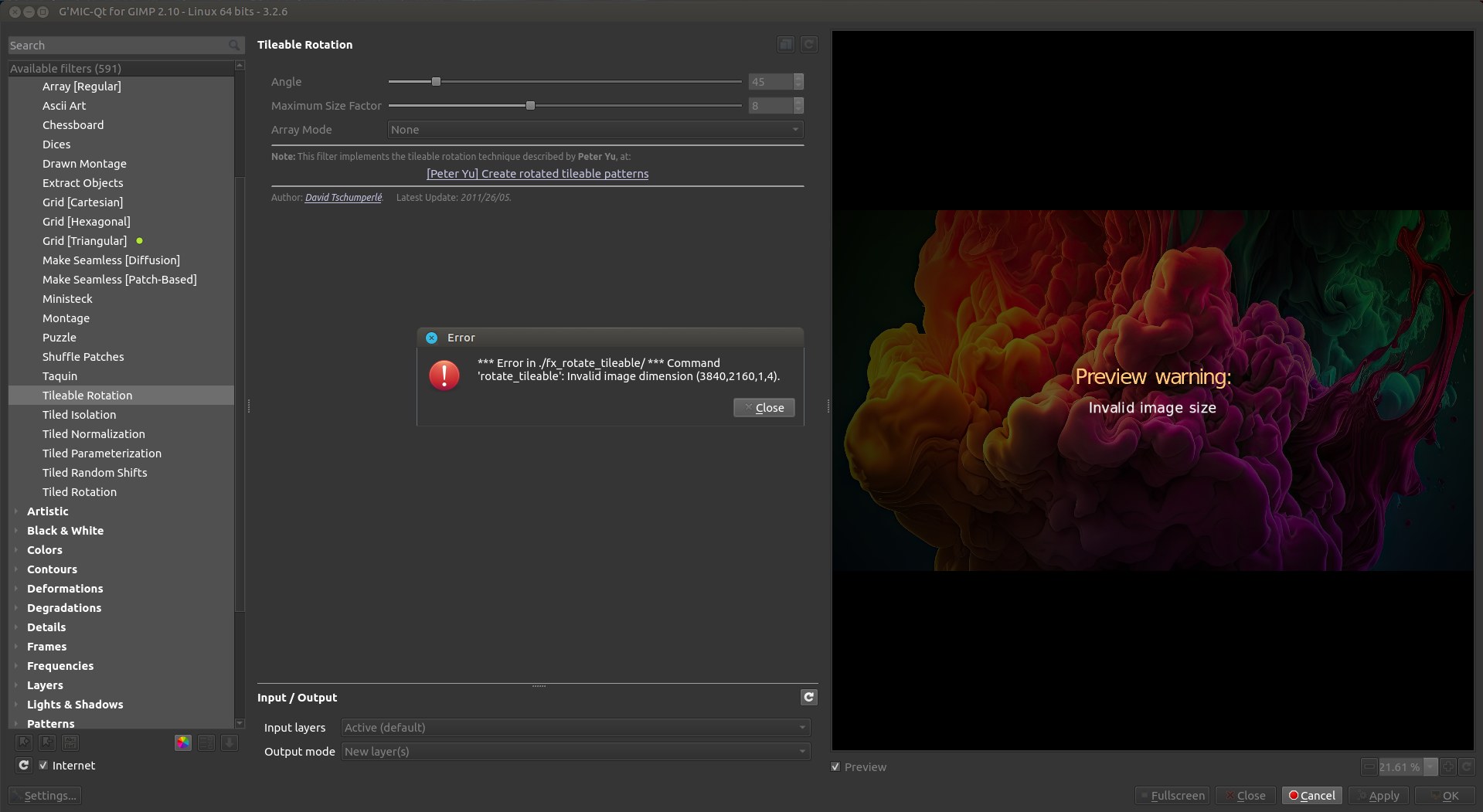 No preview (Invalid image size), and when clicked OK, I got this error (middle of the screenshot below), I tried to check the link given in G’MIC > site is under maintenance.