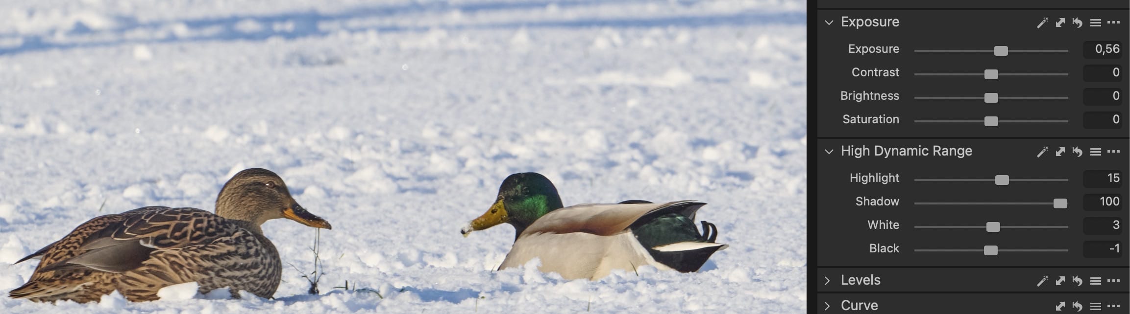 So as example to what I struggling with. This is the image as shot. Yes, it is under exposed, but that is rather as intended. So ensure the highlights are not blow out, which is extremely easy to do in snow. Please note, while this is stationary shot, birds move a lot, which doesn’t allow much time to and carefully expose.