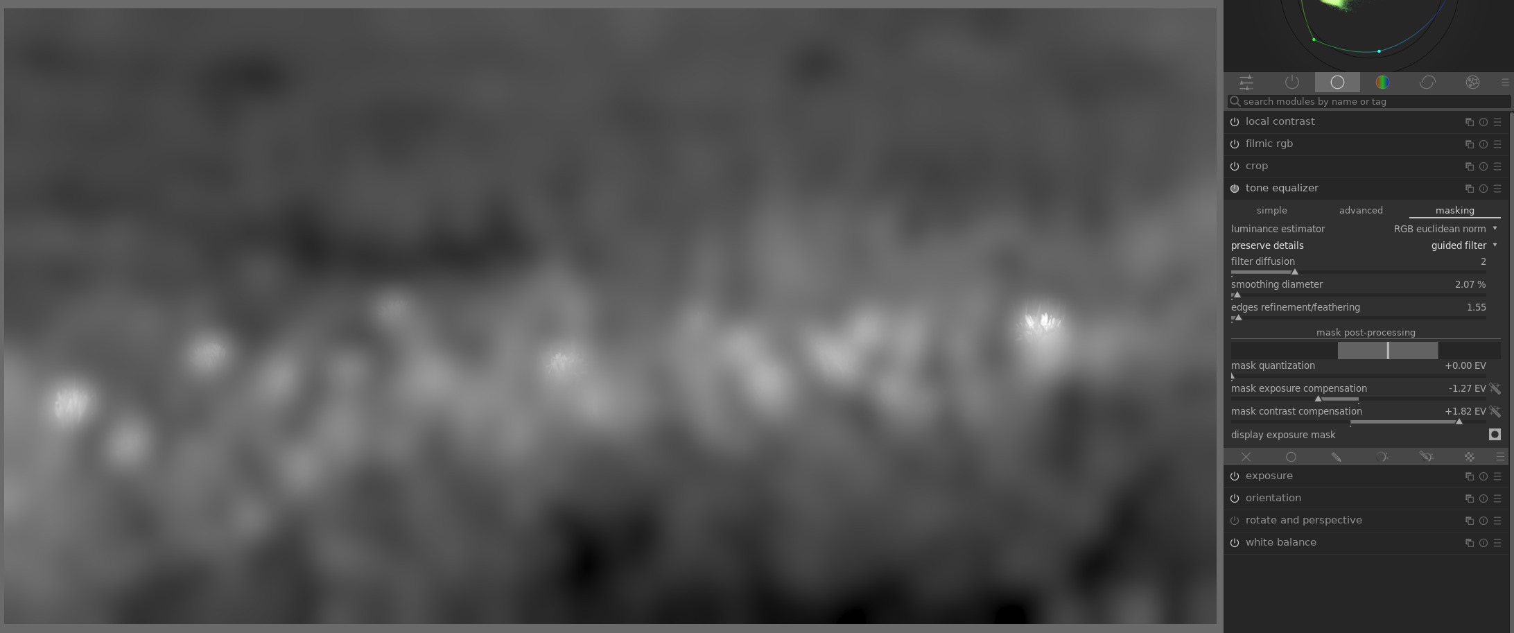In my noobish understanding of the tone equalizer, more diffusion should result in a smoother mask, but for eigf it seems to work differently. I have not understood so far what eigf should do better or why it fails to produce a “good” mask for my image and it also might not even solve the TO’s particular issue (if the region of low EV is too large) but I found myself now switching back to guided several times, because I could not figure out how to remove the very low EV spots from a mask generated with eigf.