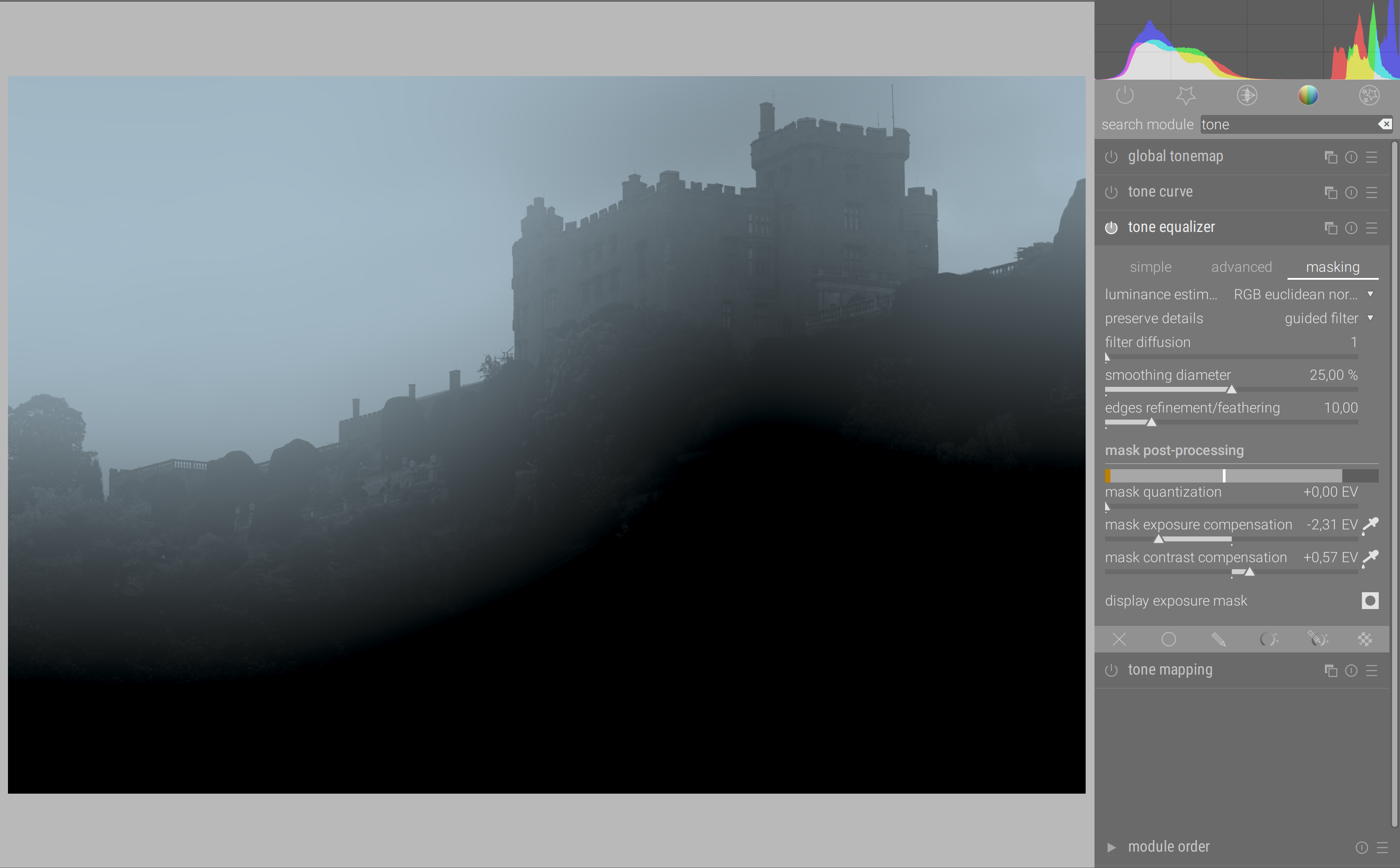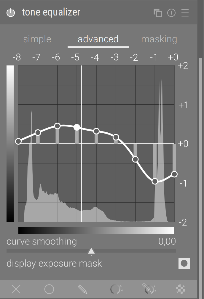 But the main difference is Tone EQ works in scene-referred, between almost 0 and + infinity. That’s why the masking needs to be adjusted to the current dynamic range.