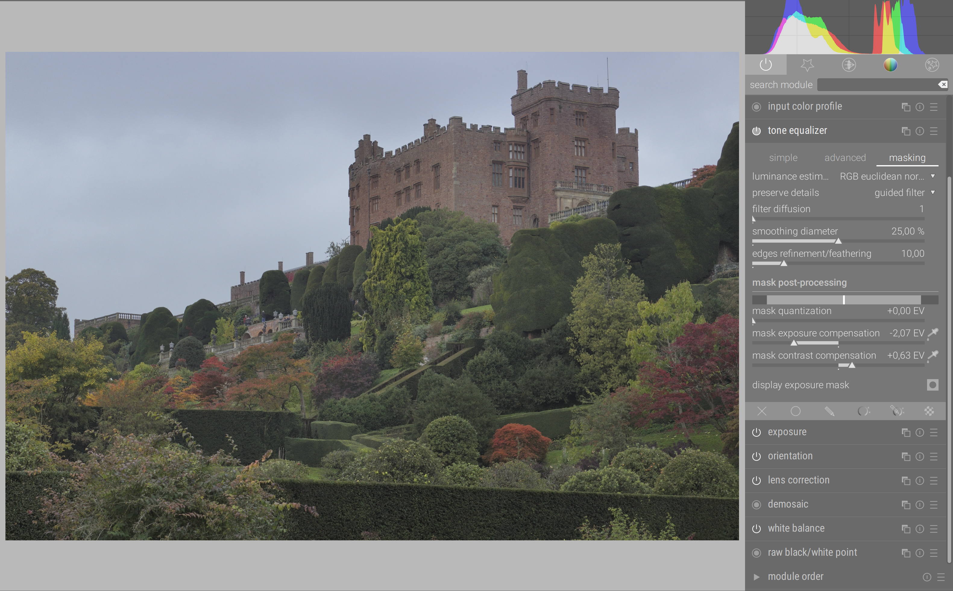 But I’ll share a file here that may show some of what I’ve experienced. This photo is not great but has some tonal variety in the vegetation that I wanted to play around with. After leaving the default scene referred options alone (exposure, filmic, etc.), it is already decently exposed, if a little flat. If I then enable the tone equalizer, go straight to masking and click the eye droppers for both exposure comp and contrast comp, I get a good distribution across the histogram. But turning on the mask, you can see that the vegetation is pretty much all masked in the same tonal range. Hovering over a dark hedge puts the line somewhere in the middle of the histogram, and it doesn’t change much when hovering over a lighter piece of foliage. In fact, I even get some inversion where some of the lighter leaves show up as -6 EV and some of the darker ones at -4 EV.