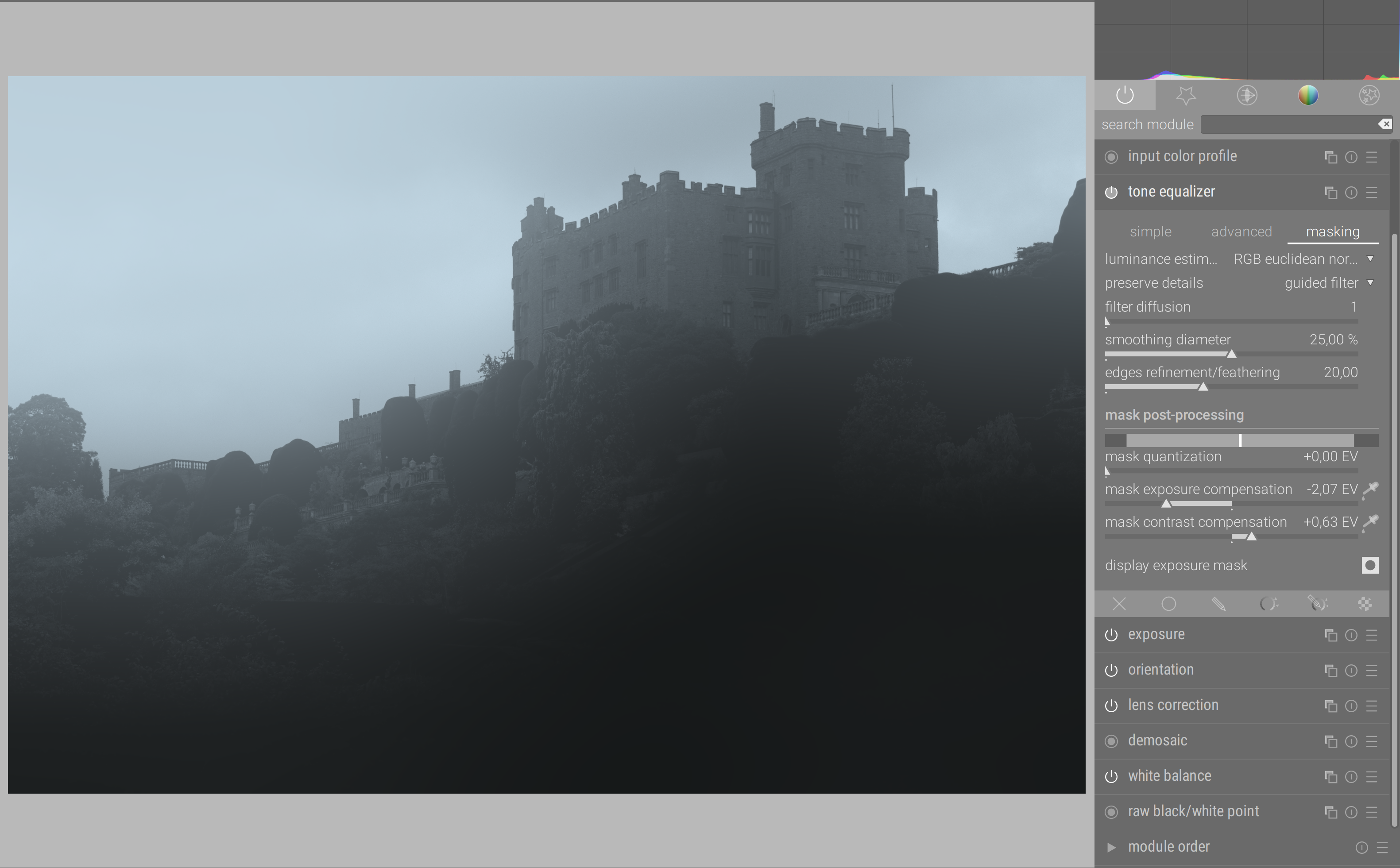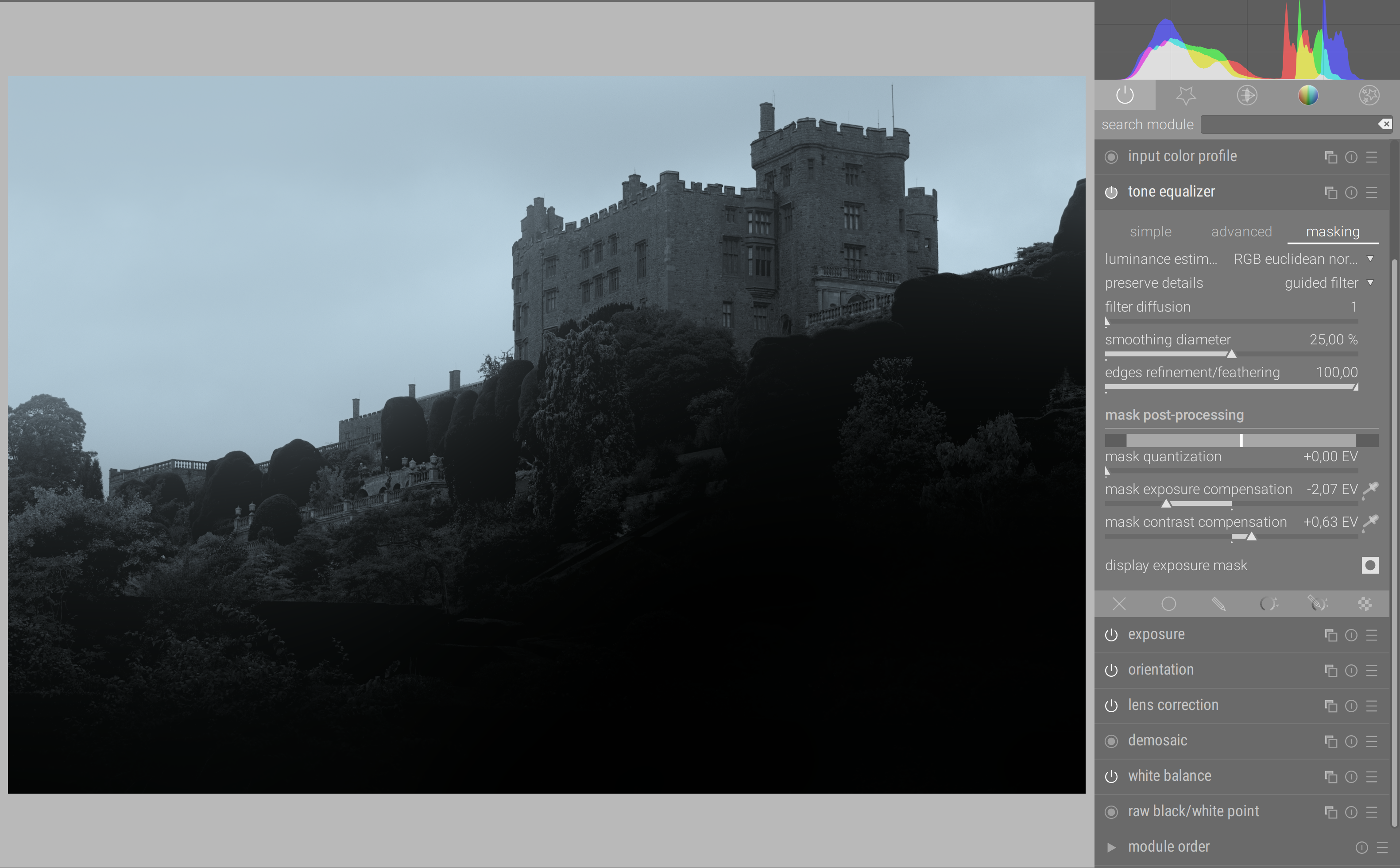 So, again, I’m not sure if this is understood : a blurry/blotchy mask is actually better preserving the local contrast of the picture than a sharp/detailed one. Having details on the mask is usually bad news, except if you plan on increasing contrast through the tone EQ, in which case it will also increase the local contrast aka acutance aka perceived sharpness – but you might consider ditching the guided filter (details preservation) at all in this case and use the simple 1D tone curve approach.