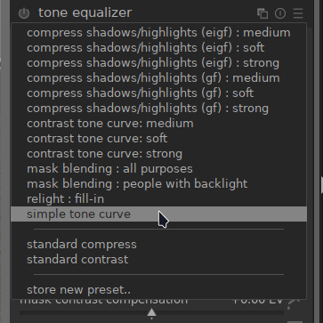 Often, just the “simple tone curve” works for most images, with preserve details set to no. Other images that have some dramatic dynamic range differences perhaps need the other presets.
