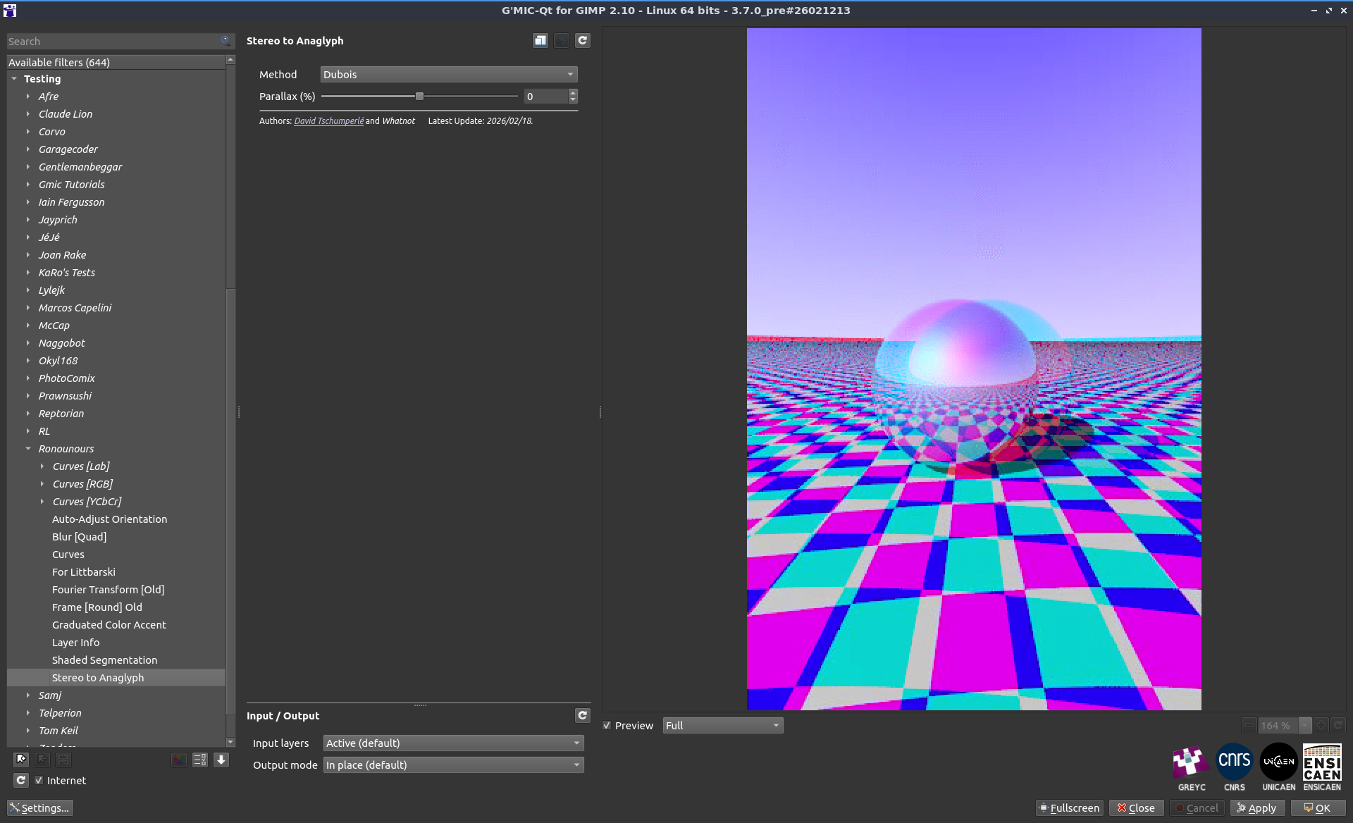 What you could add though is an option to exchange left and right before doing the anaglyph, because stereo images come in parallel and crosseyed viewing variants and it would be convenient if you could quickly swap left and right before conversion if you have a crosseye image that you want to convert, and it’s easy to implement in GMIC I think.