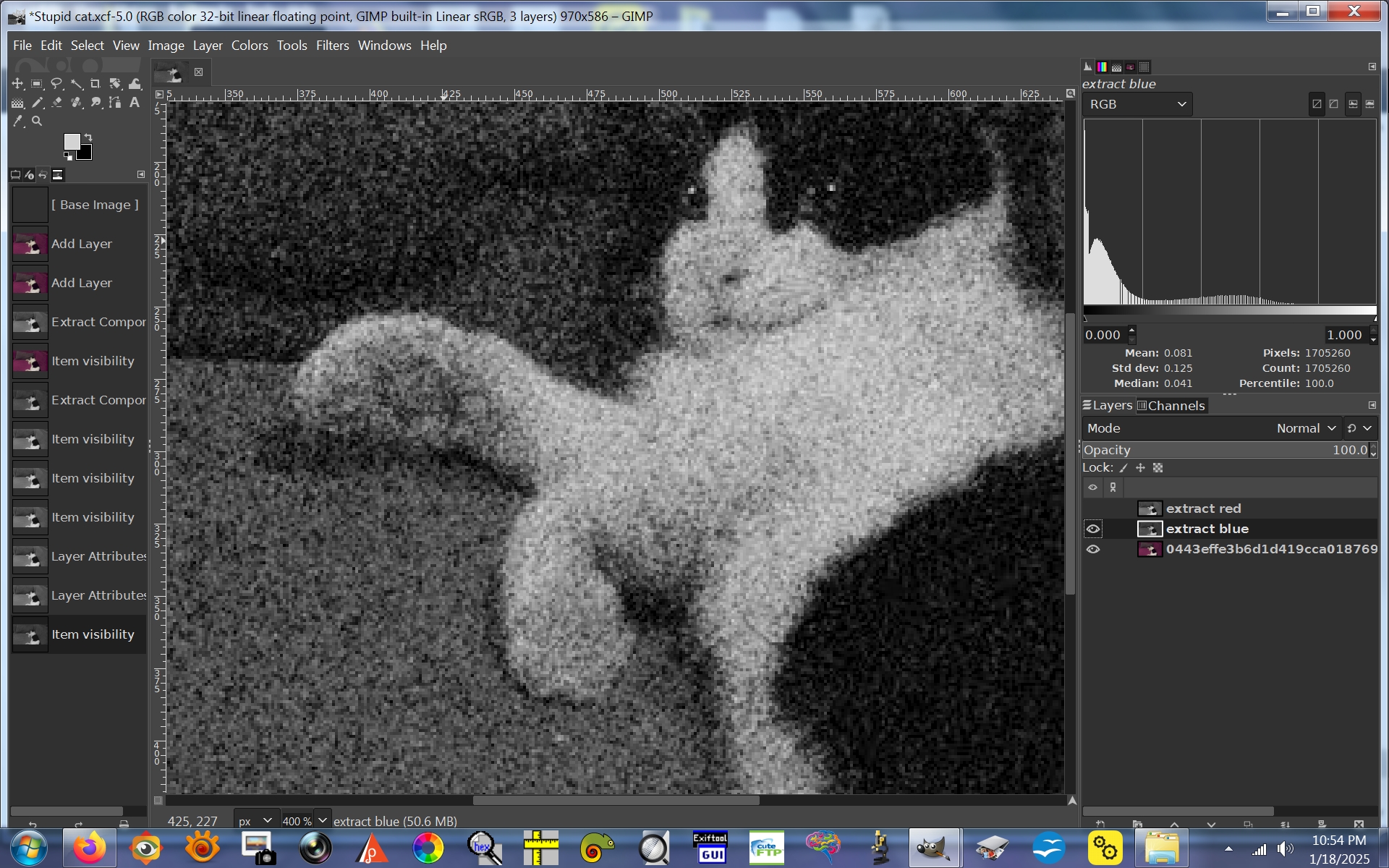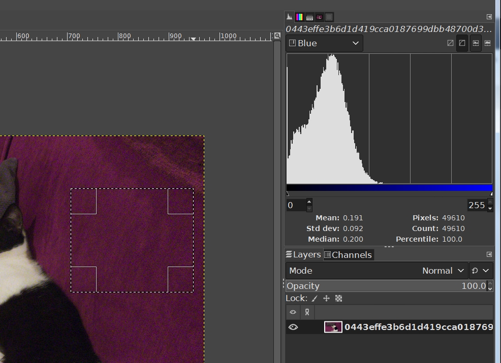 On the other hand, there is a huge noise problem with the first (purple-ish) image’s blue channel either in the original capture or in dt, I don’t know which.