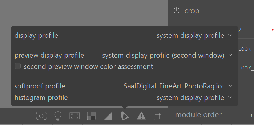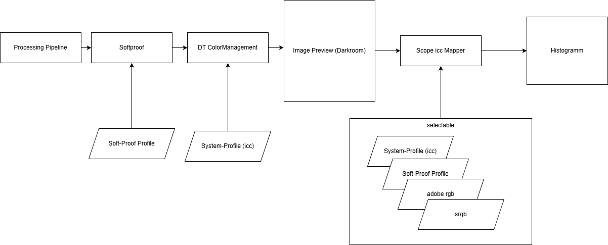 If soft proofing is enabled, LCMS (the colour management library) still converts to the display profile, but but with soft-proofing turned on. As I understand, this means LCMS will apply the soft-proofing profile, and then convert that to the display profile (trying to show how e.g. a printed image would look, converting the printed colours to your monitor’s space). Then, as previously, this is sent to the histogram, but the histogram profile is set to the soft-proofing profile (unless it is a CMYK profile, in which case Rec 2020 is used).