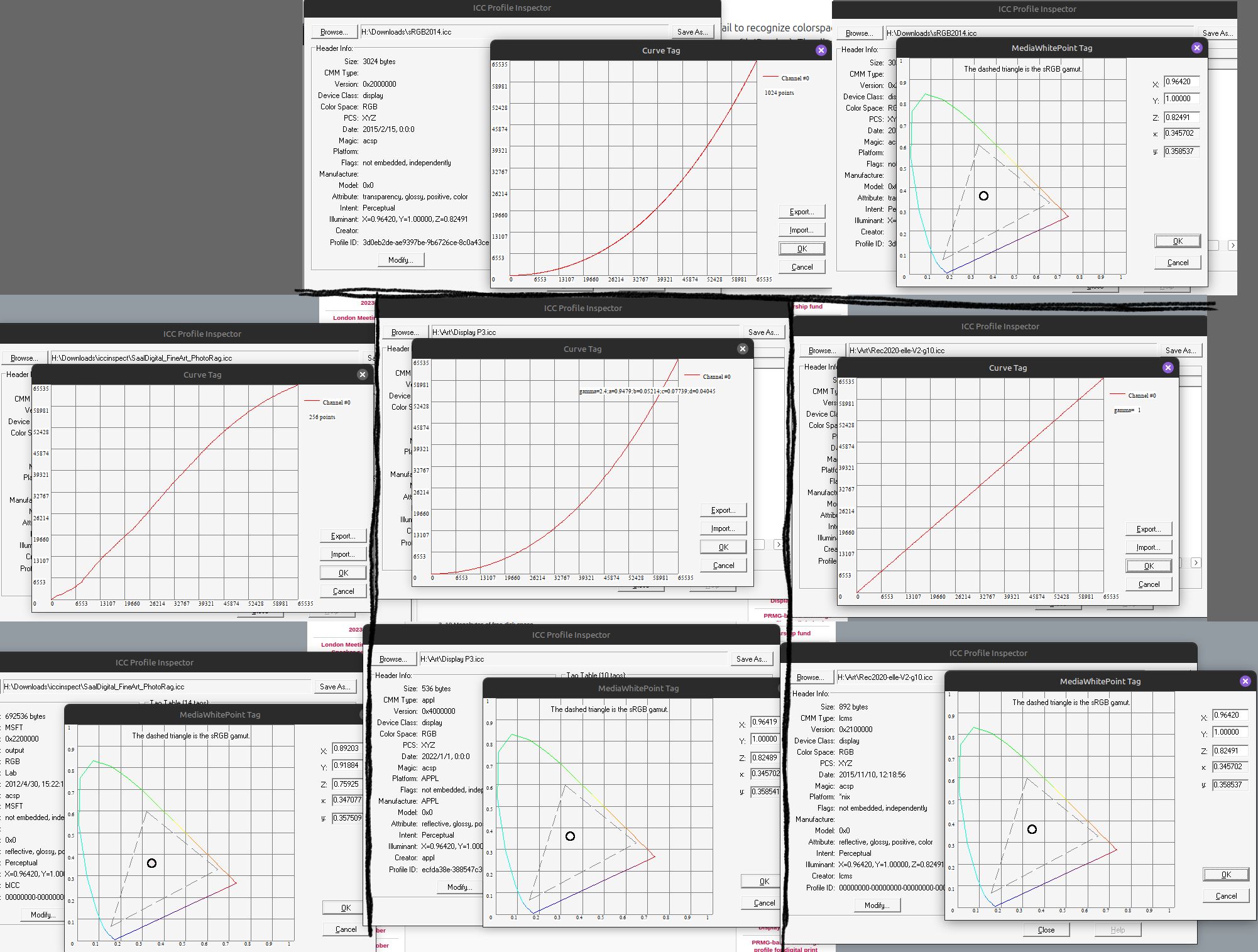 I’m not an expert but I’m relatively confident about colour management. I’ve downloaded the colour profile you linked, and I found ICC’s profile inspection tool. I’ve made a comparison of the transfer curves and white points of the printer, sRGB, Display P3 and linear Rec2020.