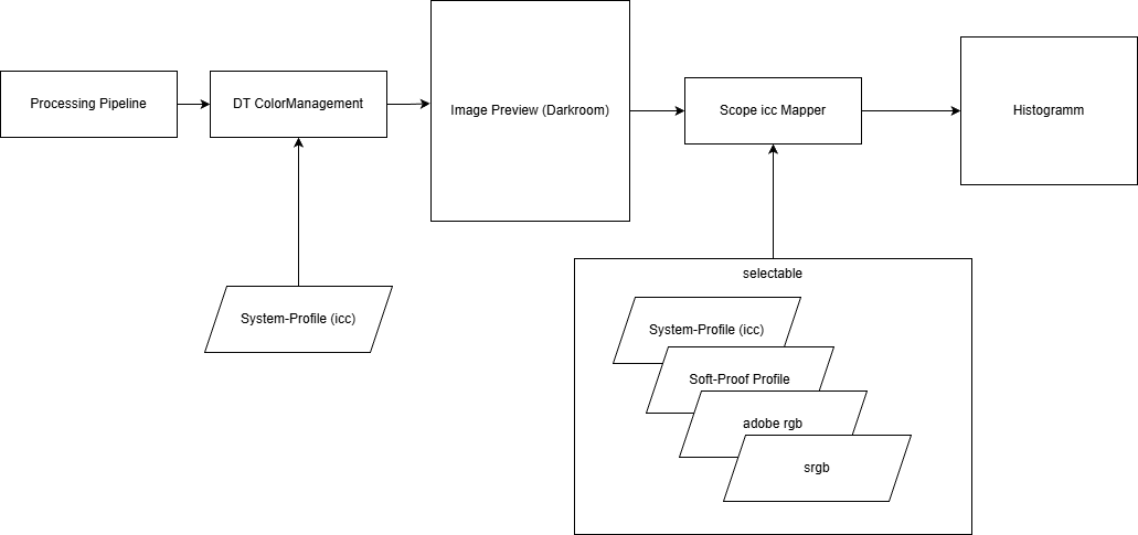 Oh, that makes it more clear to me. Pixelpipe → display colour profile for centre view and navigation preview, and that data is then sent to the scopes module. (Then the scope converts it back to the selected histogram profile, e.g. output or softproof profile)
