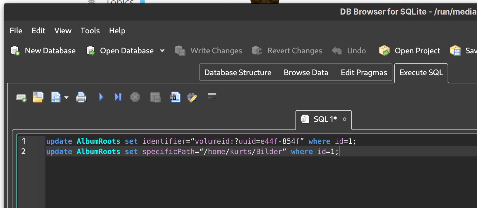 update AlbumRoots set specificPath=“/home/kurts/Bilder” where id=1;