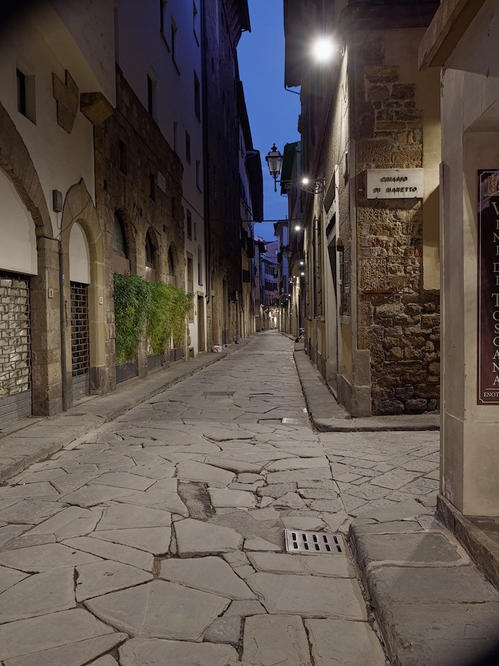 As an example of low-light performance of the 12-35 mm: The empty street in Florence (pre-dawn) was shot at f/3.5 and 1/15 s at 15 mm and 1250 ISO. With both IBIS and lens stabilization, I think the image is acceptably sharp. BTW I have my own presets for denoising that I mention here: Denoising in a PlayRaw