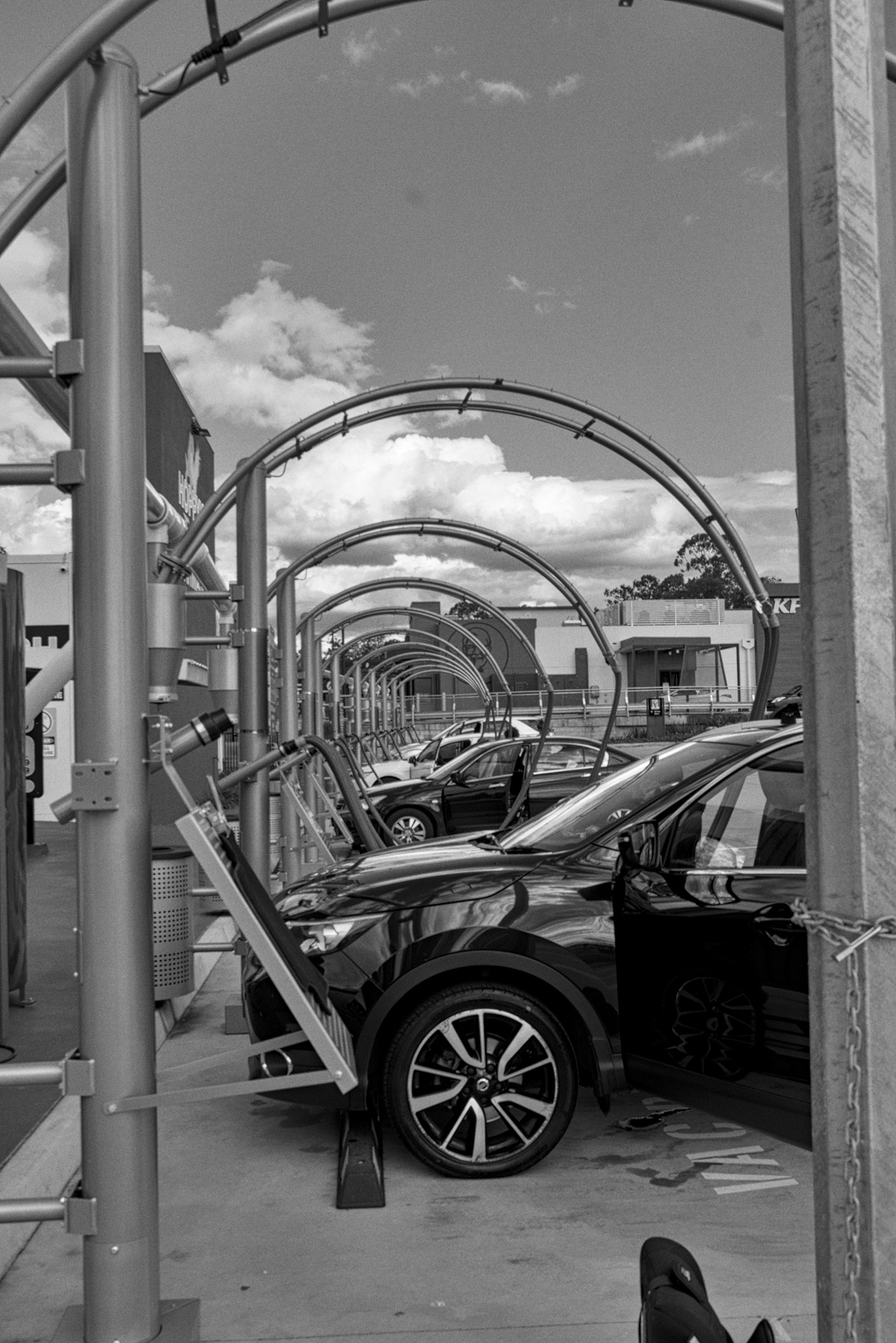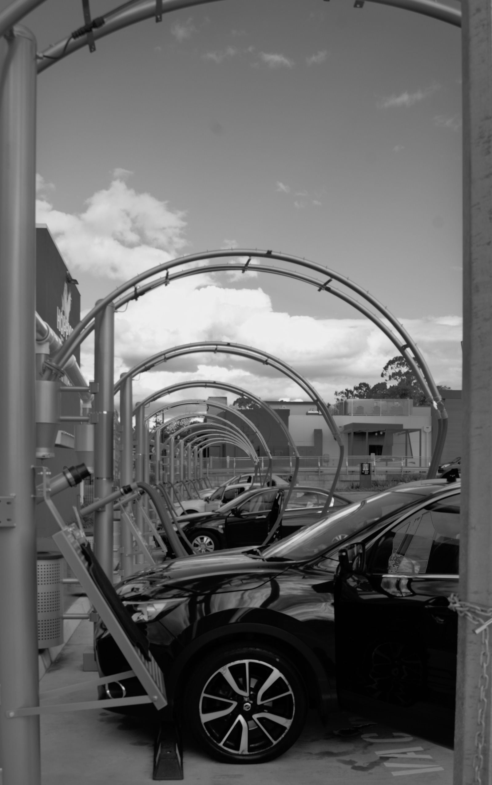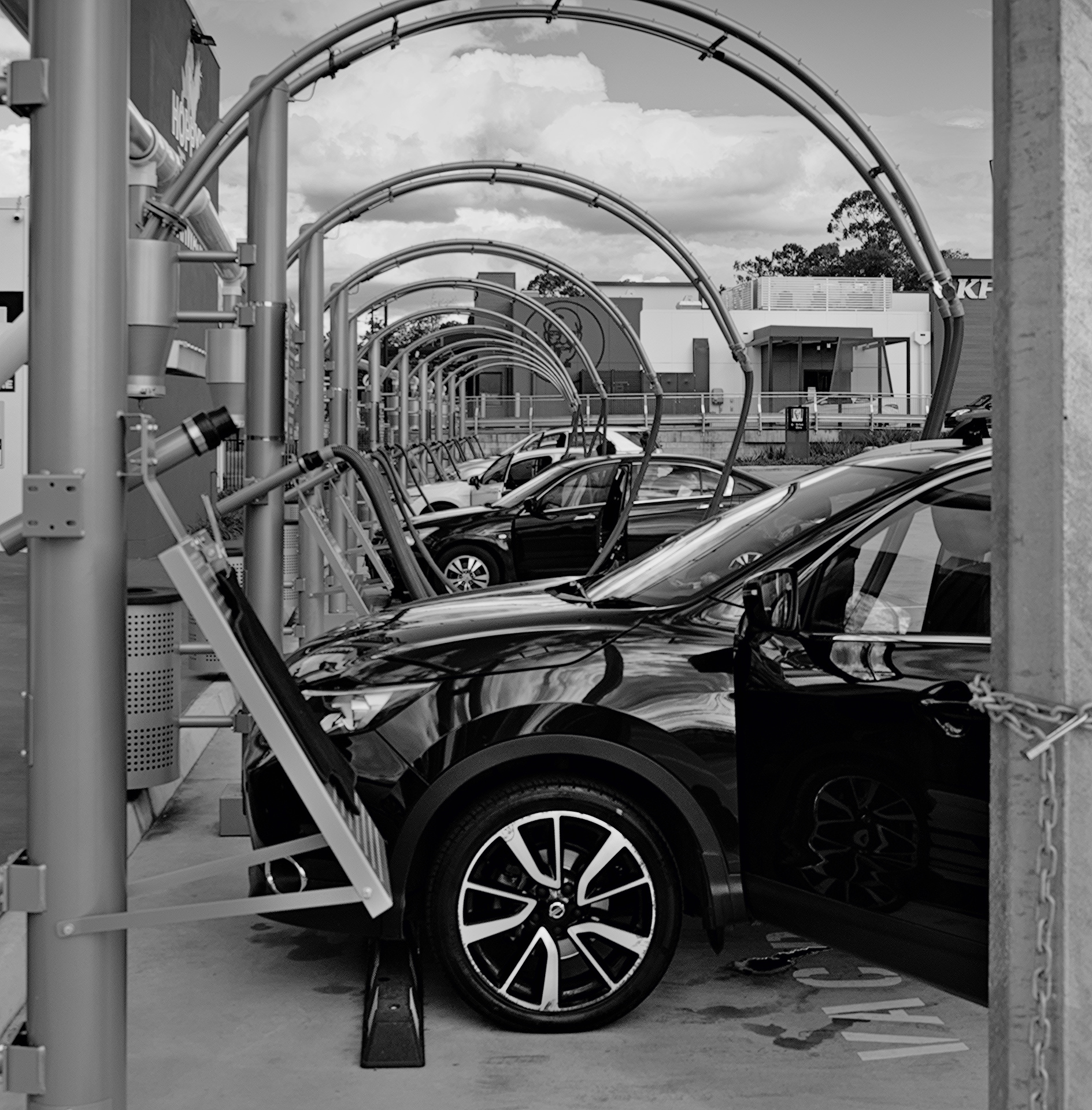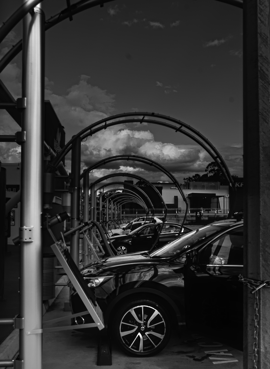 On a walk in my neighbourhood today I noticed this tunnel of car vacuum installations. I have very little past experience in editing for texture and shape; wanting to preserve the reflections on the fender of the front car, yet also enhance the contrast of the arches. The attached RAW is colour, but colour (especially of the blue sky) distracts the eye, IMO. Then again, the red of Colonel Sanders’ franchise does help pick out the furthest arches from the background. Your mileage may vary.