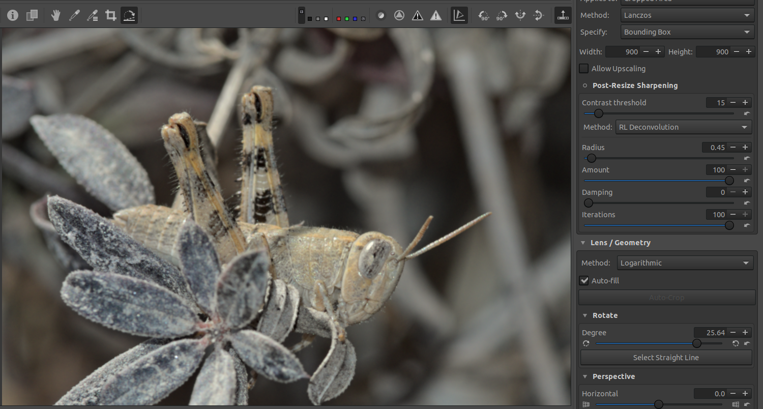 I run RT 5.8 over Ubuntu 18.04. I recently took a number of insect macros, which required straightening/ fine angle adjustment . I worked with the RAW files (.PEF) in usual manner, adjusting contrast, color, sharpness etc first and fixing the angles just before the final crop. I noticed that after changing angles via “Straightening/Fine rotation” the image quality dropped considerably. The image deterioration became visible on RT (while still in RAW) as well as in the saved .jpeg file. At first I thought that it happened as a result of auto-cropping during the fine angle adjustment procedure, but when I cropped the the original image (without changing angle) to the same size as the RT did while adjusting the angle, I found no deterioration in the earlier file, not in RAW neither in saved .Jpeg. Interestingly, changing an image angle via preset 90 deg or "Flip horizontally " or “Flip vertically” has no effect over the image quality . What could be the problem and how to fix it?