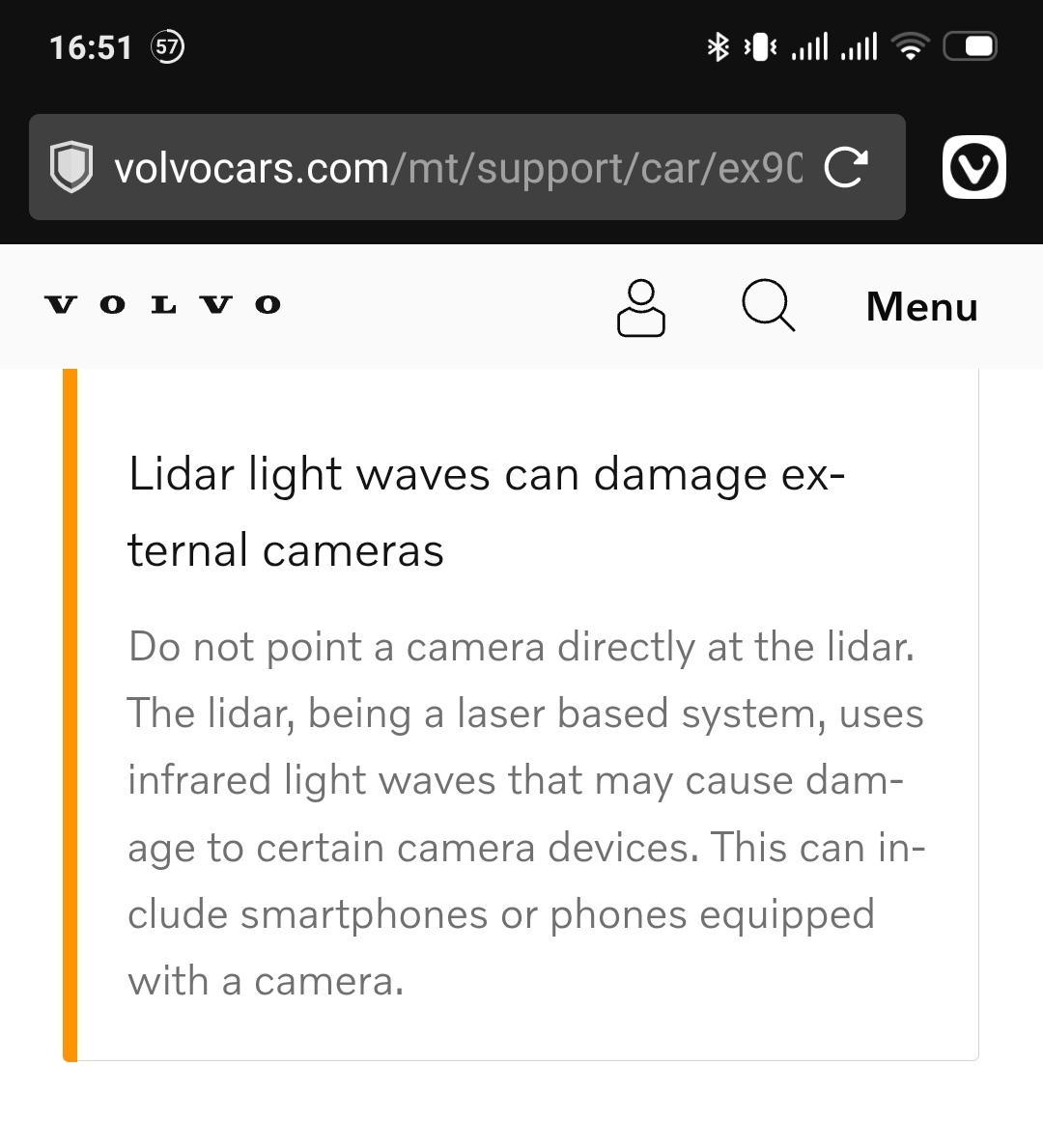 From reading multiple articles, it looks like volvo change the wavelength on the lidar to a “safer” for human eyes but it allows them a higher energy. The increase in energy is to attempt to “see” farther away. Interesting stuff.