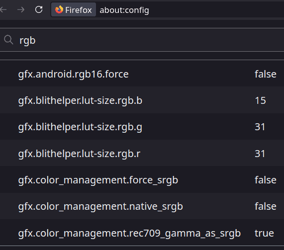 native_srgbsetting? I read on the web that “It hands off color management to the system” (whentrue, I suppose). I don’t get why it’s nottrueby default, then. Perhaps that changed recently – that would explain why I did not notice the differences until today. What’s the point of letting the browser do weird stuff with our colors? Unless letting Firefox handle this (false) allows it to parse the embedded profile, but that would mean that Firefox’s weird warm display is the most accurate one and that _all the other apps, including RT, have been misleading me?