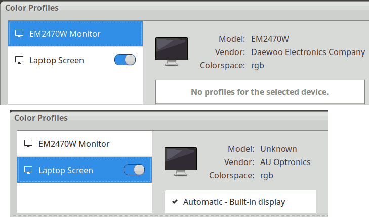 - My new HP laptop’s Xubuntu has a weird “Automatic - Built-in display” color profile enabled by default in the system settings, for the internal monitor.