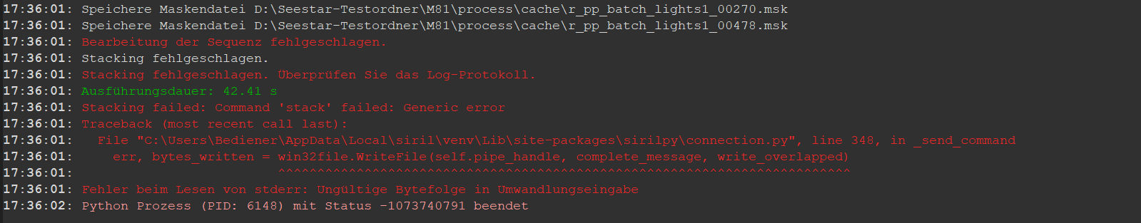 Wenn ich mit Siril 1.4.0 ein Stack verarbeiten will läuft der nie durch.