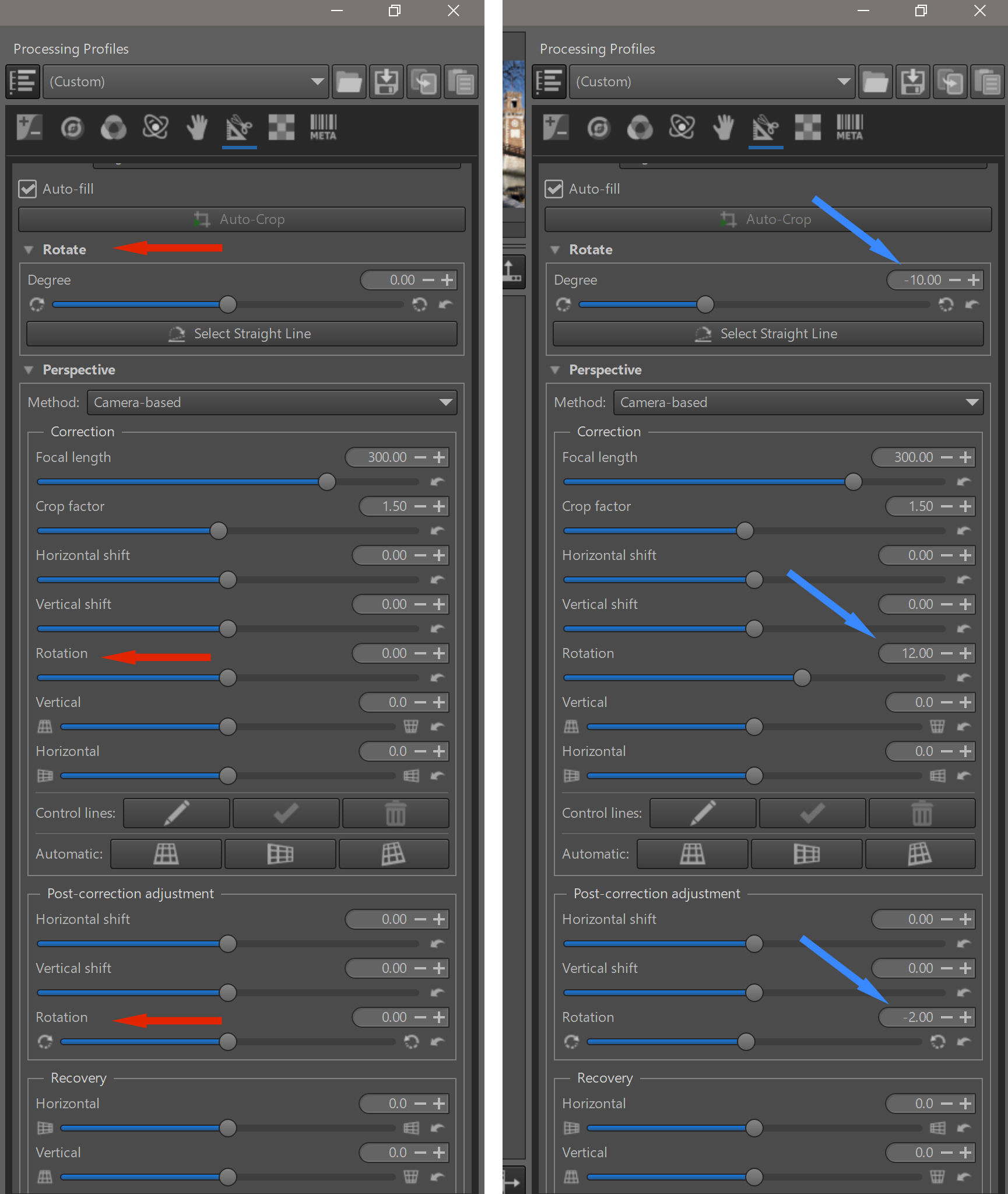 Here’s another example. Start with the default values. Add some horizontal or vertical correction. Try each rotation slider and observe how they affect the result. The first two should behave the same because there are no adjustments in between them. The last one is different and behaves more like what you would expect rotation to look like because there are no more transformations applied after it.