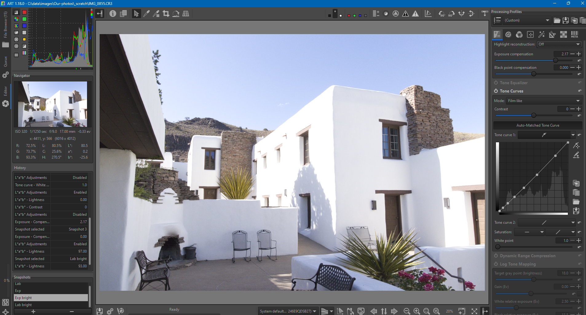 - 1st tab: exposure + tonecurve-contrast