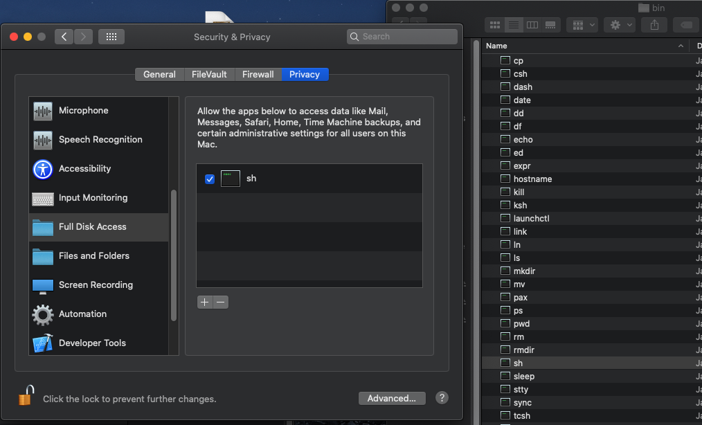 It allows to access to every folder without adding /bin/sh to Full Disk Access under Privacy in the Security & Privacy Control Panel.