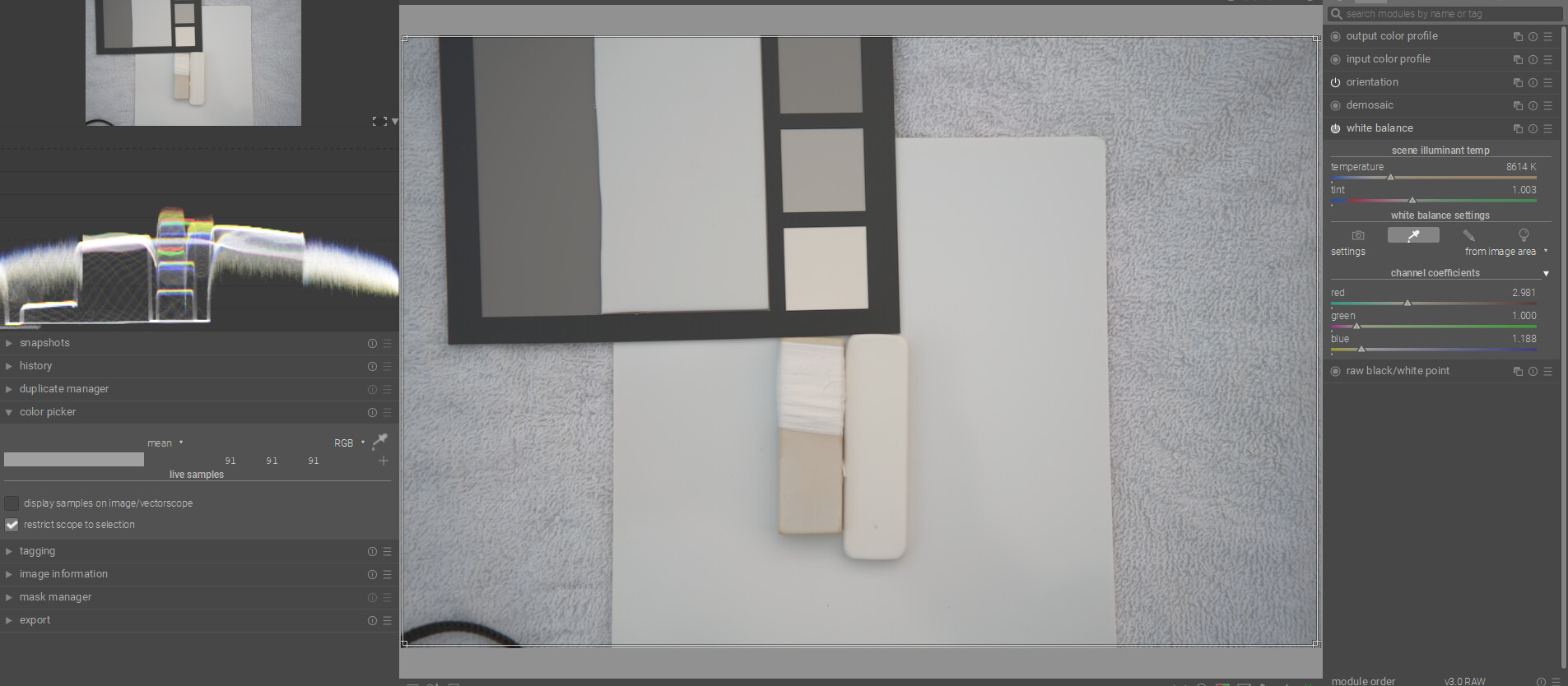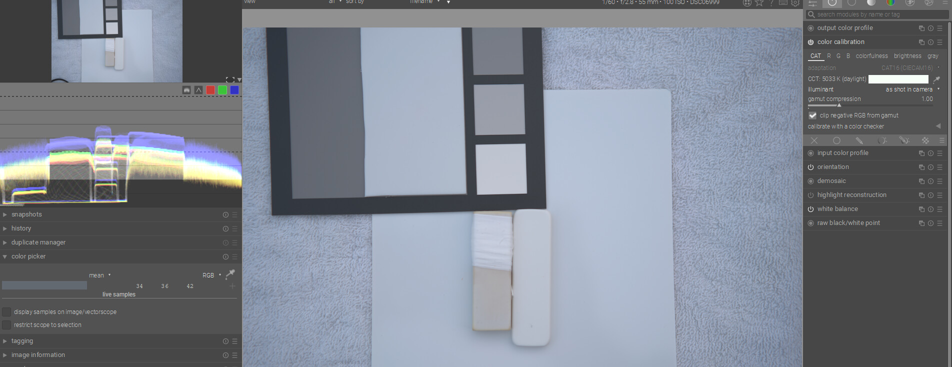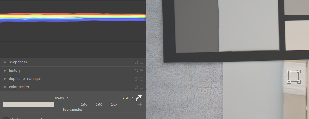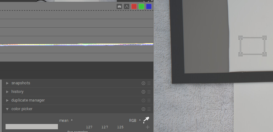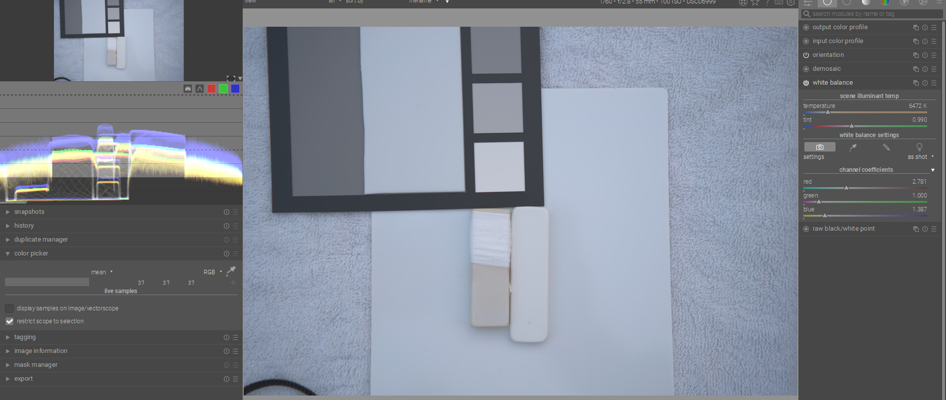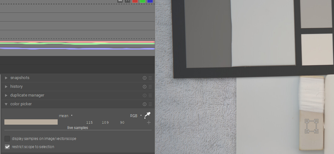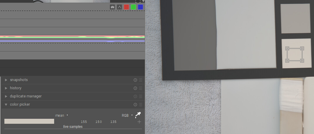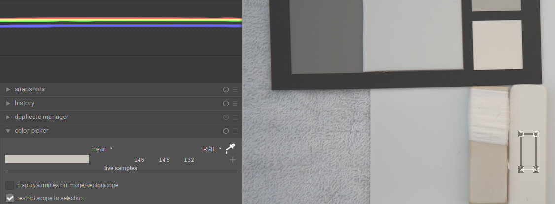 I think with DT you can have the best of both worlds…if you have a card then you can use the color checker mode of the C C module and get a fairly accurate WB and exposure as they are evaluated. As you point out the white on the Spyder card is a bit warm so if you use it on its own you might actually overcorrect your images…Doing scene referred edits in my mind you just need a nice neutral reference … gray or white so that you can set WB…so in that case the Porta looks good. BP and WP are relative and more fluid than what you might see with a display referred edit…so to me a “white” patch for exposure is less important