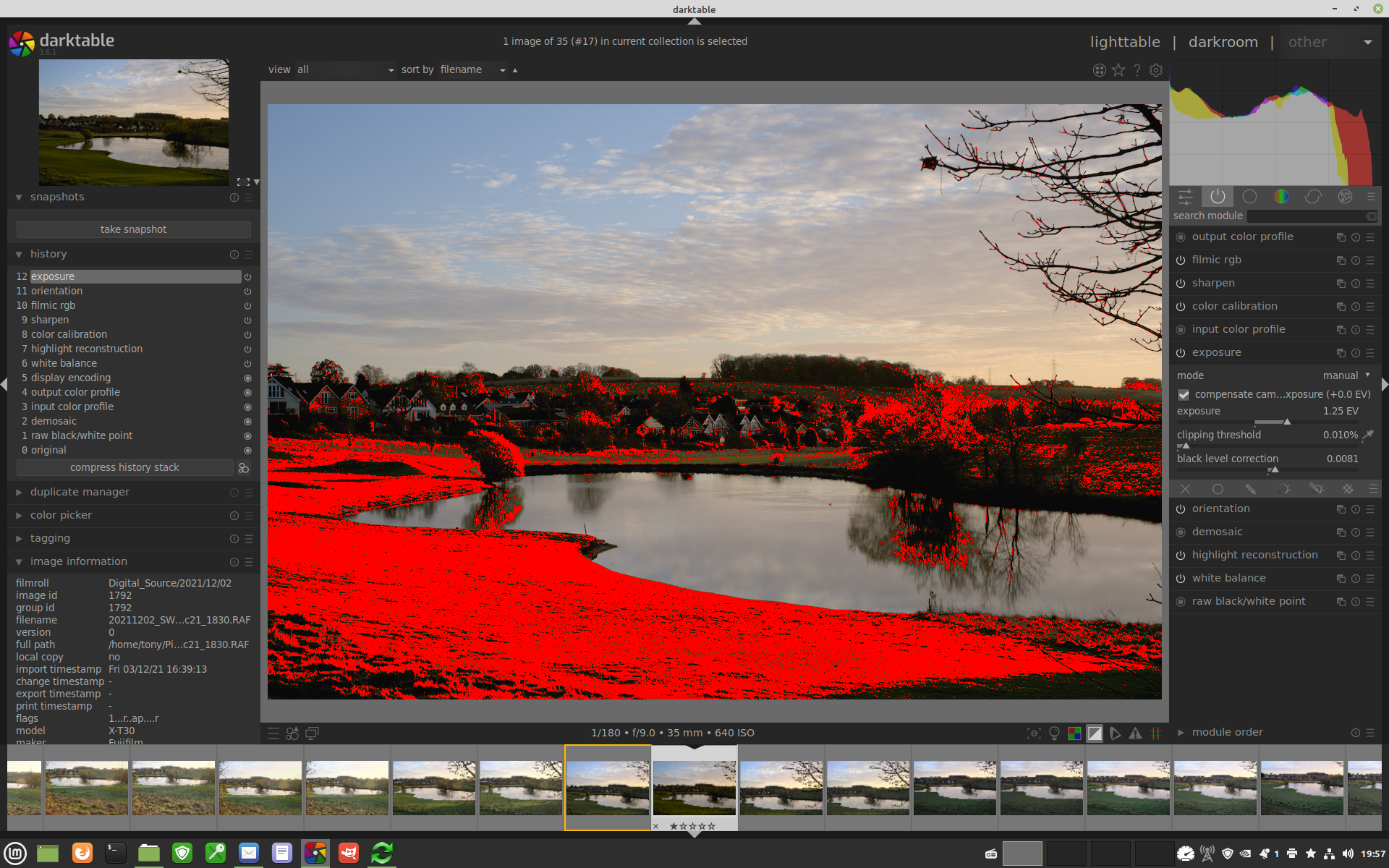 I have raw landscape image taken just after sunset. When opened in Linux version of dt 3.6.1 the ‘land’ part of the landscape is really dark. The histogram extends to about 70% (missing the right hand end). I cannot alter the exposure value to anything higher then -0.1 EV without the clipping indicator showing a lot of red. Transferring the RAF.xmp file to my Windows install of dt 3.6.1 allows me to increase the exposure to at least 0.95 EV without any clipping, at which point it looks about right for an image taken at that time.