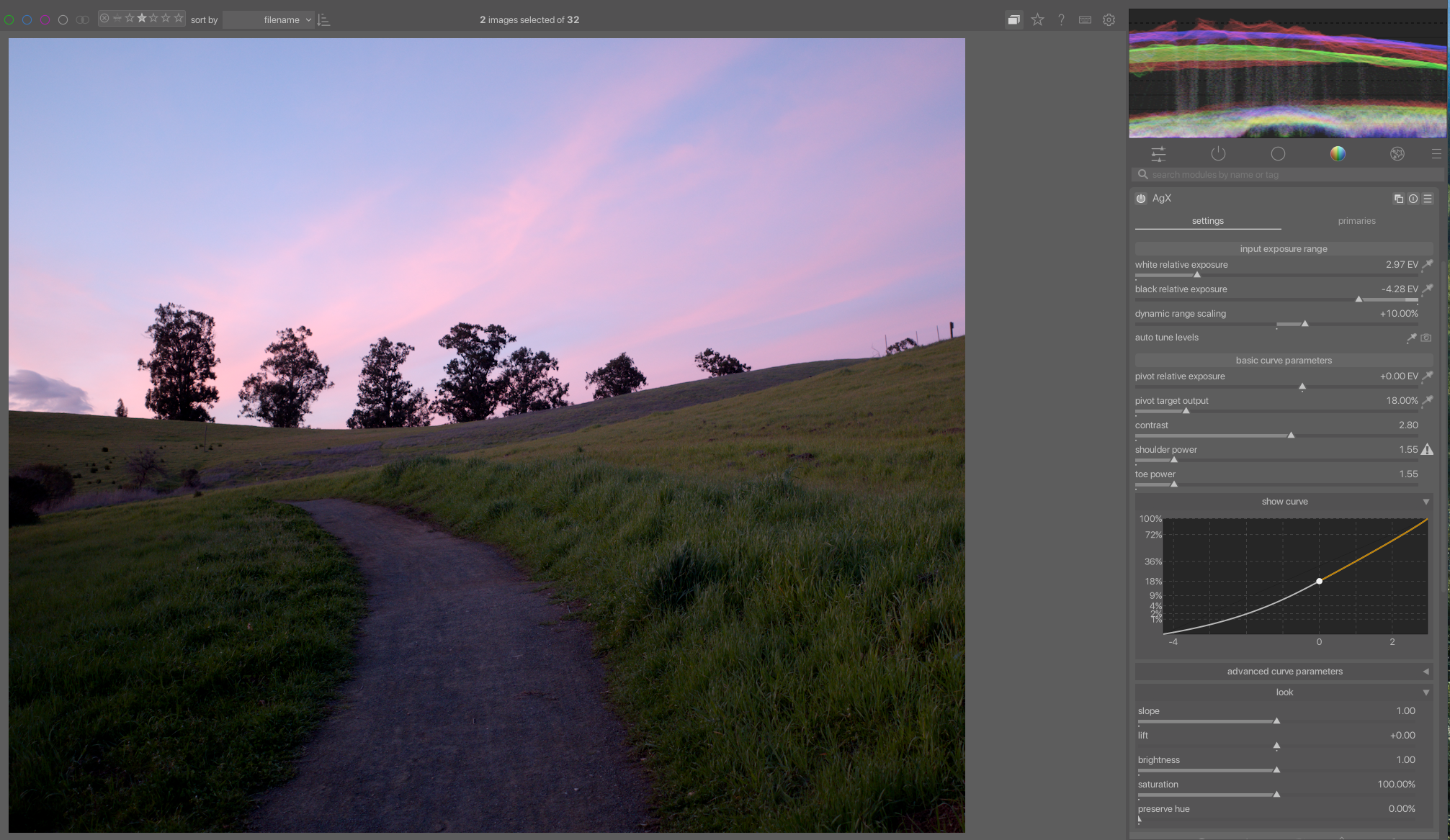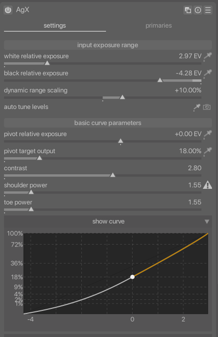 Kofa supplied a sigmoid like default preset for AgX which I have adopted as my default AgX starting point. It has a bit more contrast and saturation because of the extra contrast. This is the preset that was supplied if you want to try it. In the preferences for DT the preset option includes an import option to install it.