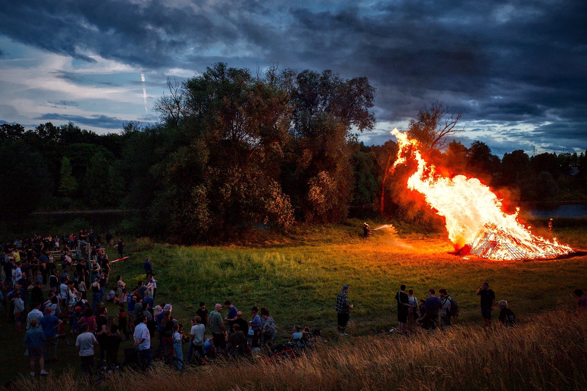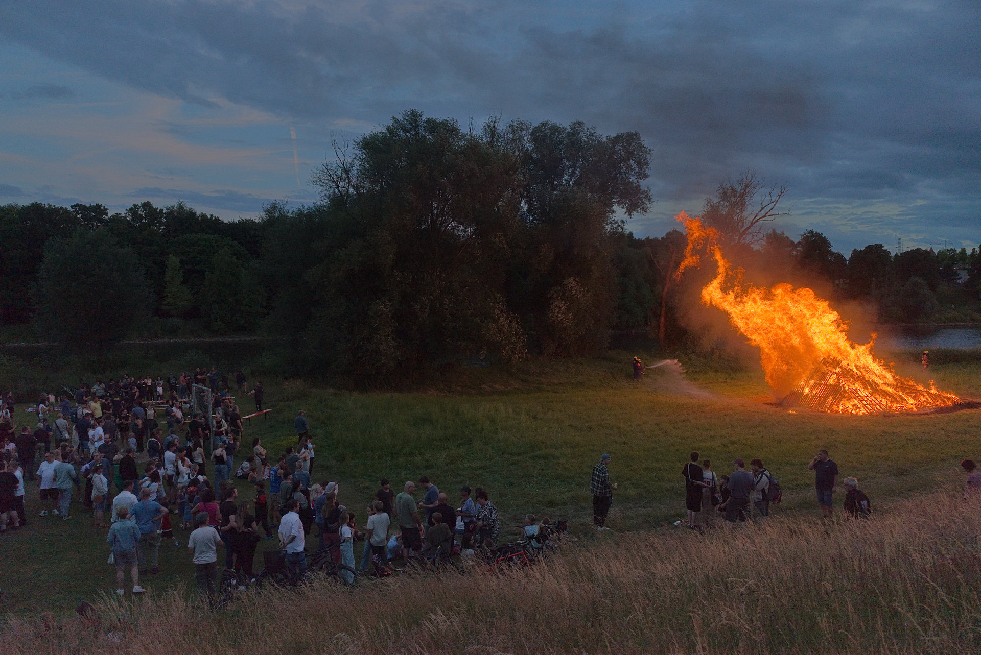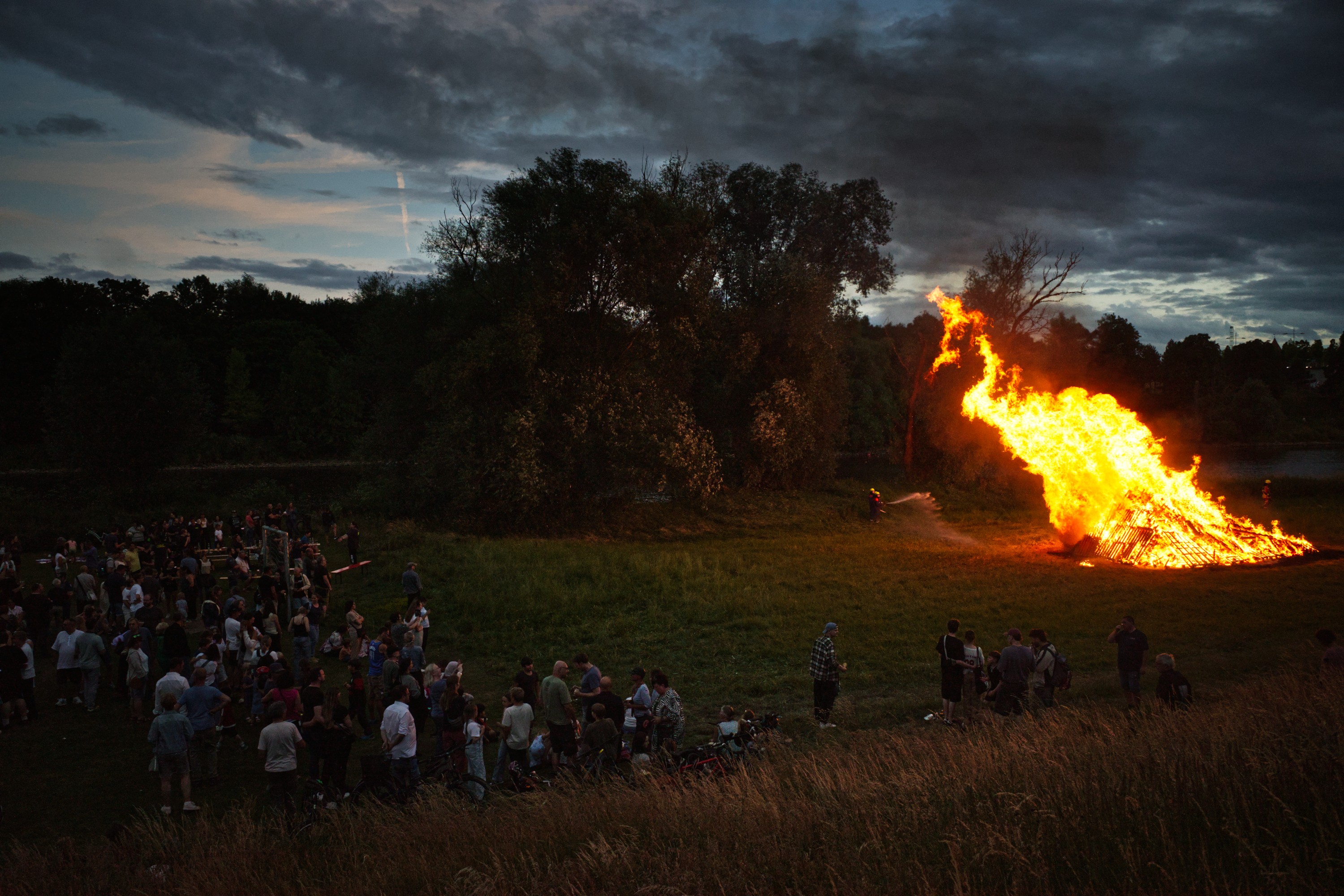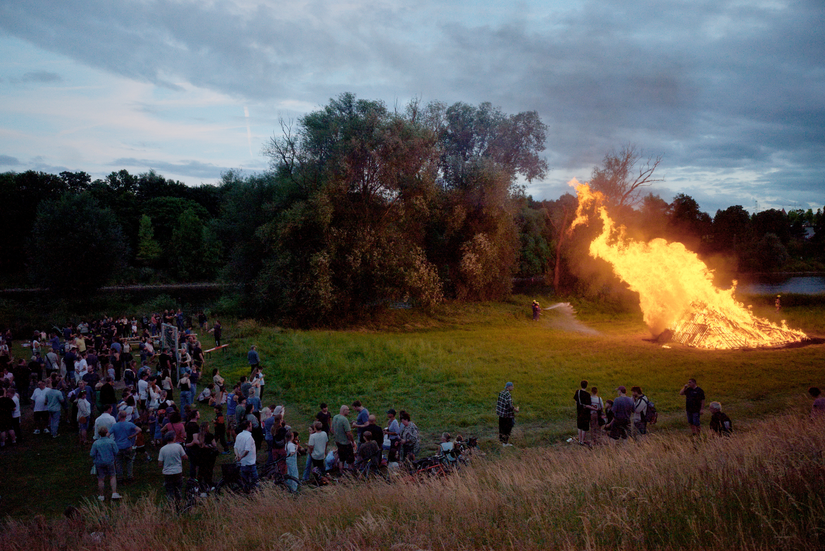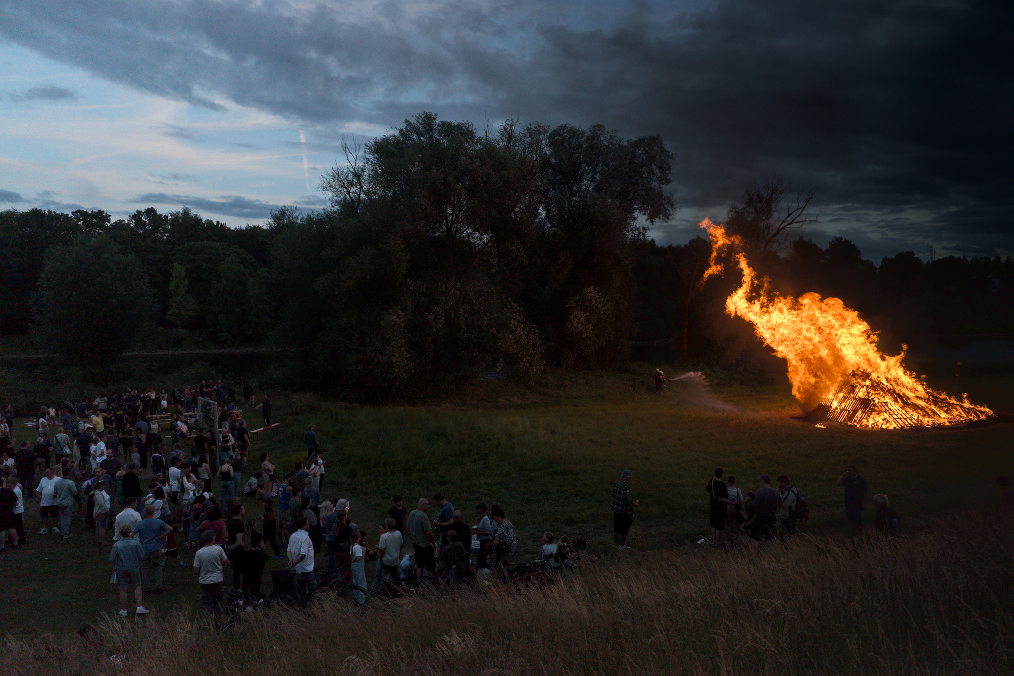 For what it’s worth, I remember it was still relatively light when the bonfire was lit. Most of our renders emphasize the contrast between the brightness of the fire and the darkness of the crowd. But when I stood there, it was still bright enough to comfortably read, and the fire didn’t seem overbearingly bright either. It registered more as heat than brightness.