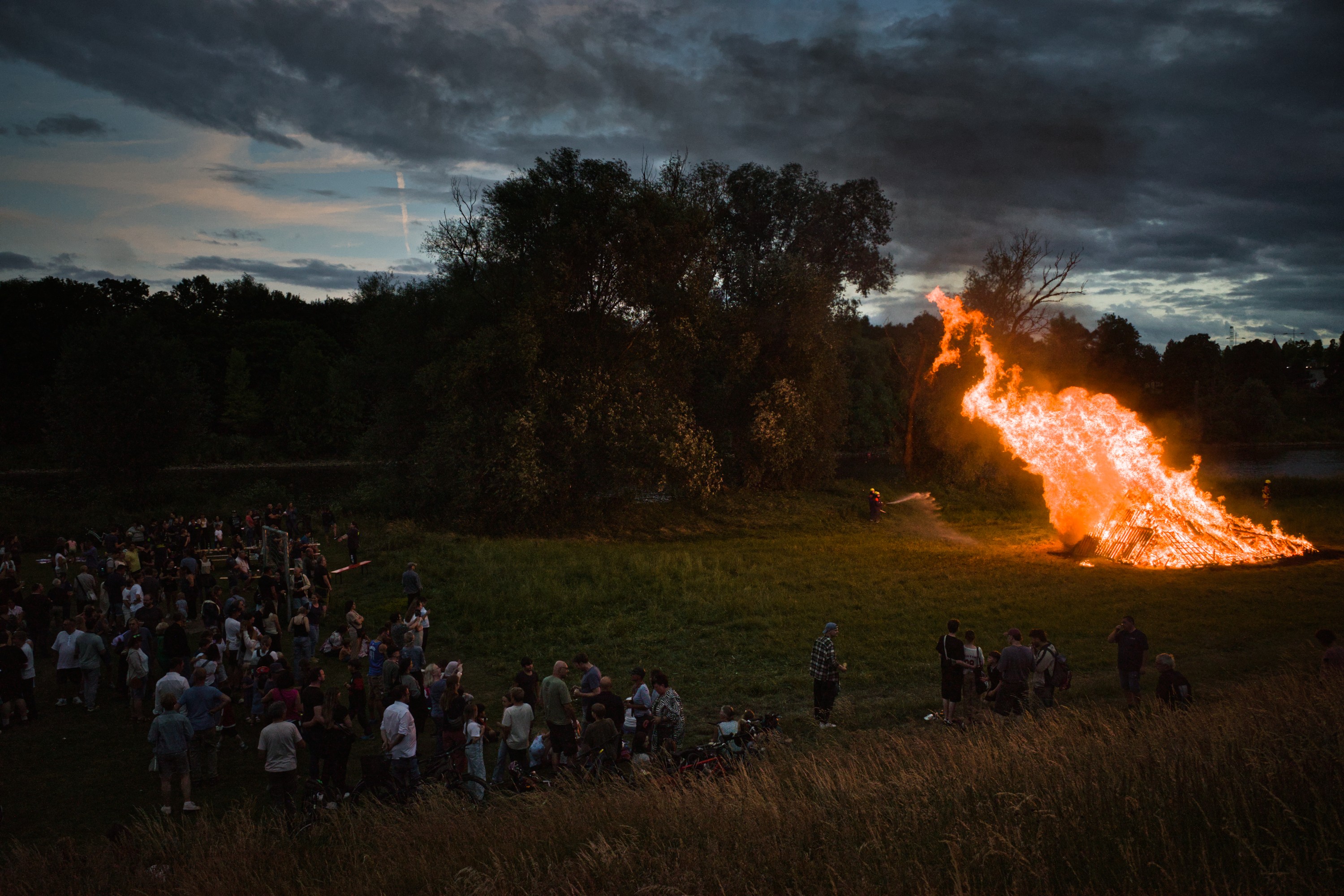 The way I see this scene, the central element of this photo is the blazing fire, like a small spectacle around which people have gathered, and that should be emphasized. All other elements, such as the blue sky, can serve as a frame to further enhance the main motif: