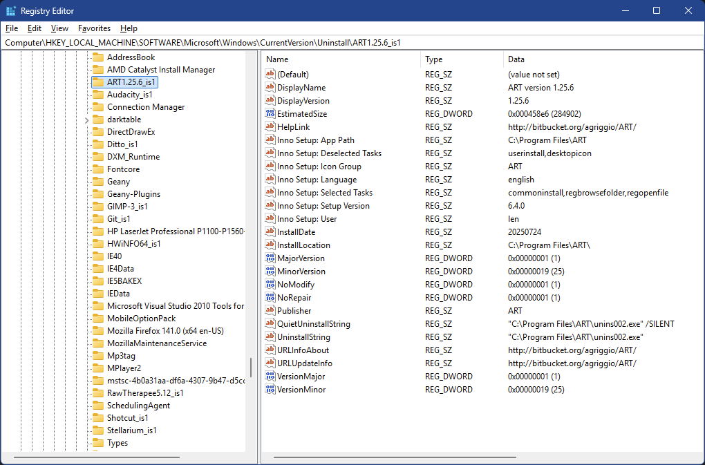 That’s what I do – install into just C:\Program Files\ART, with no version info. However, it’ll still leave uninstall data in the registry from the previous version,* so you’ll have to clean that out manually from Computer\HKEY_LOCAL_MACHINE\SOFTWARE\Microsoft\Windows\CurrentVersion\Uninstall\