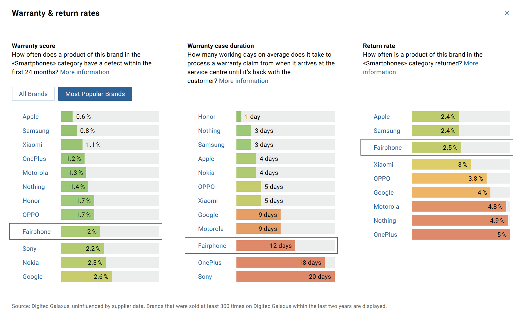 What may skew statistics further is that most users probably buy Samsung and Apple devices via the phone providers (at a discount, in exchange for a binding loyalty contract). That wouldnât skew the reliability stats directly, though, just the actual popularity of phones in the population vs popularity with digitec customers. There may be an indirect effect, if most people buy âflagshipâ products from the phone companies, and the reliability of those flagships is different from the average reliability of the average phone digitec sells (or the other way around: people buy lower-end devices, potentially for free or very little money, from phone companies vs the mix they buy from digitec).