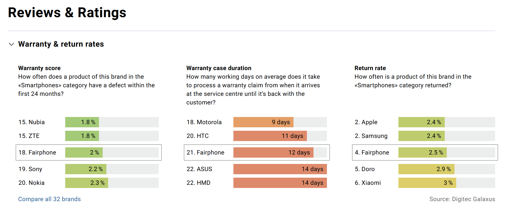 Interesting. This would suggest Samsung is one of the best brands out there for warranties/returns. They are in the top 3 in all categories. But as @paperdigits pointed out, forums and online discourse can really paint a different picture.