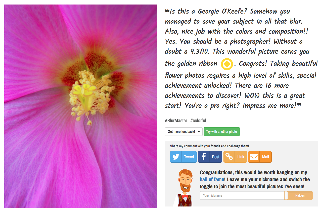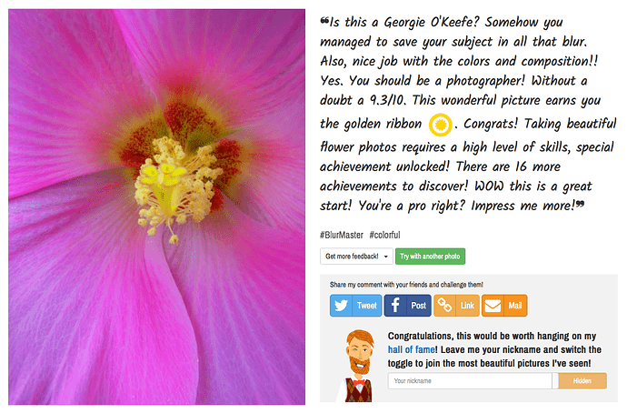 “A bit blurry. Aesthetically nothing wrong here, but something is missing. The blur and lighting maybe? This deserves a 5.4/10. Now you’ve got the idea!”