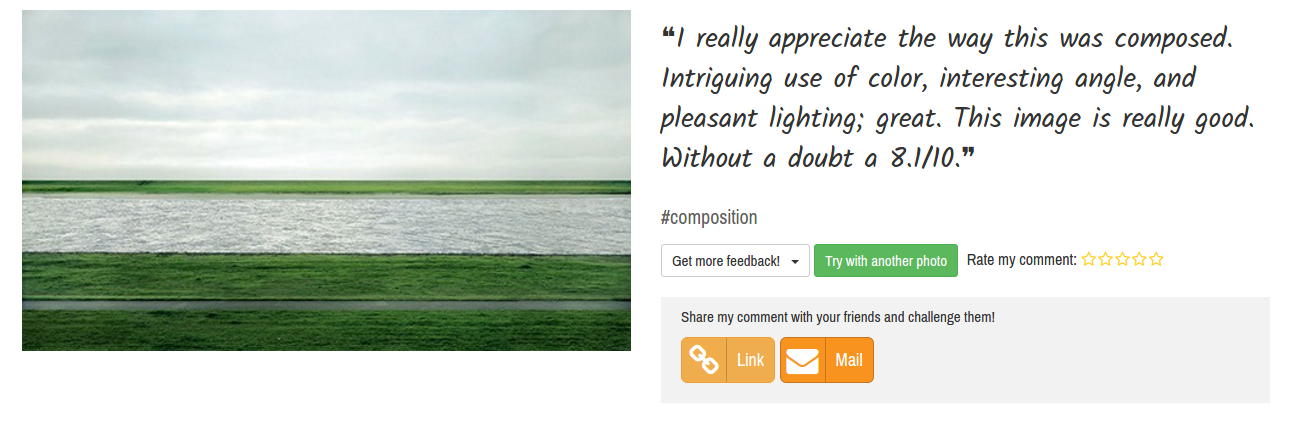 “Beautifully placed subject, and this is a good level of detail. This is a solid image. You get a 7.3/10. Everything is so perfectly framed that you get the framing ribbon ! That’s a very decent photo for a start! Can you show me something even better?”